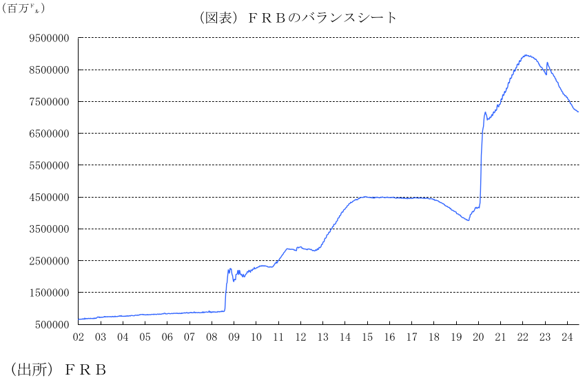 24年9月17、18日に開催されたFOMCで、FRBは20年3月以来、4年半ぶりとなる利下げを決定した。政策金利を市場予想中央値の25bpを上回る50bp引き下げ、FFレート誘導目標レンジを4.75~5.00%とすることを賛成11人、反対1人の賛成多数で決定した。この決定に、ボフマンFRB理事が25bpの利下げを支持し反対した。他方、バランスシートの縮小策は、継続することを決定した。