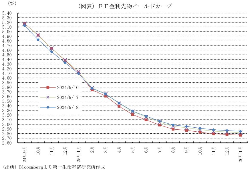 FRBの金融政策スタンスを示すFOMC声明文は、「FF金利の目標レンジの追加調整を検討する際、委員会は今後のデータ、今後の見通し、リスクのバランスを慎重に評価する」と追加利下げの検討はデータ次第であることを強調した。また、パウエルFRB議長は、「50bpの利下げが新たなペースと見なすべきではない」としたが、「適切なら、利下げペースを速めたり、緩めたりする」と大幅利下げを否定せず、「政策は前もって決めず、会合ごとに決定する」と会合ごとにデータ次第で利下げ幅を判断していく方針を示した。