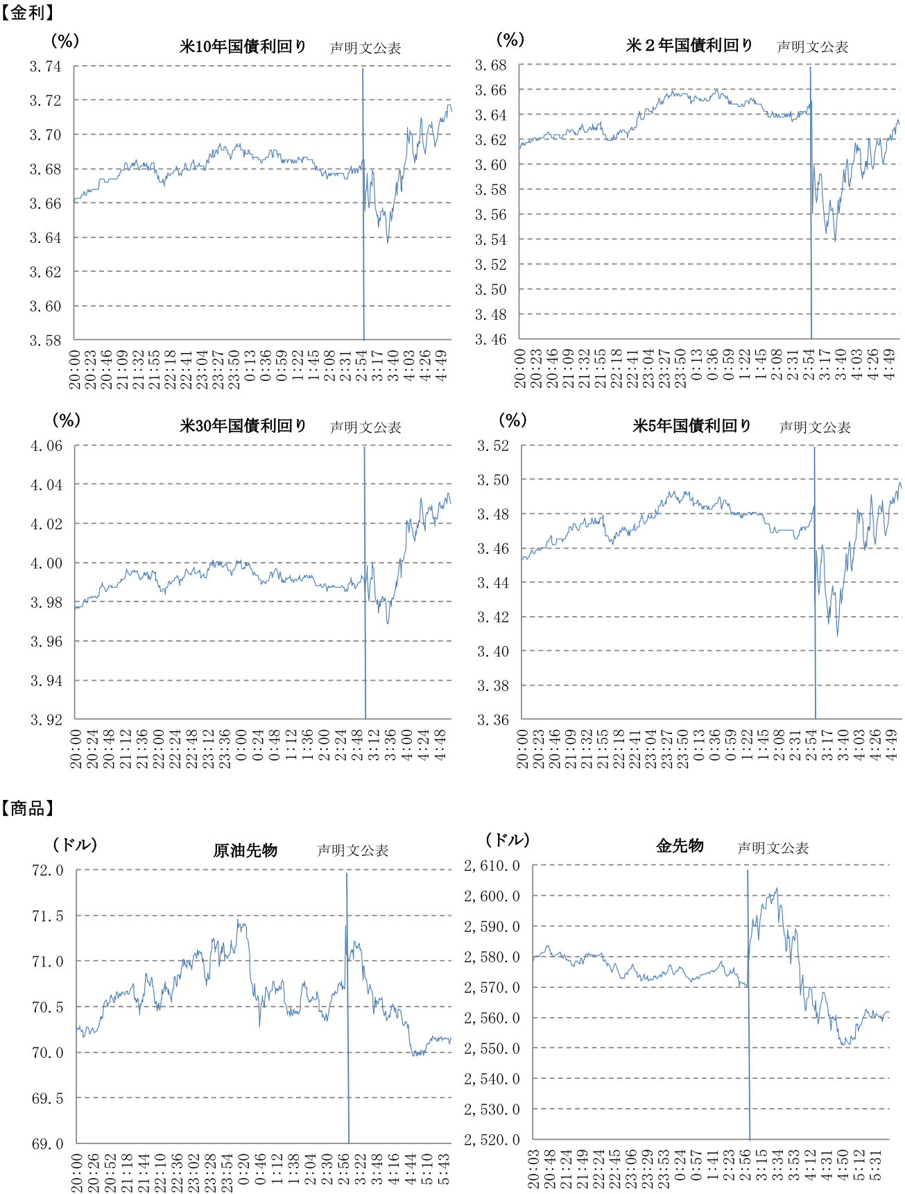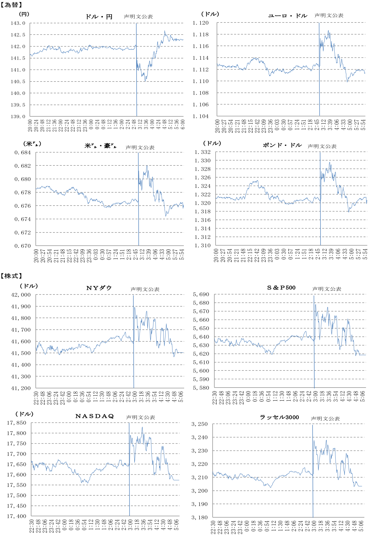 金融市場では、声明文発表直後は、金利は低下し、ドルが主要通貨に対して弱含んだ。しかし、パウエル議長の大幅利下げの継続を否定するような発言を受け、市場金利は上昇し、ドルは主要通貨に対して強含んだ。株価は水準を切り上げた後、下落して取引を終えた。