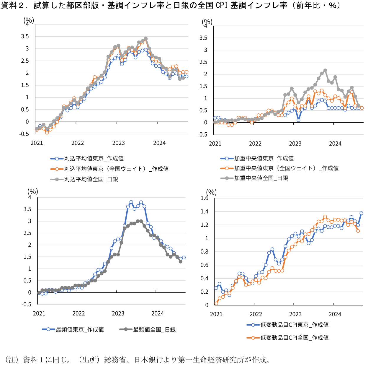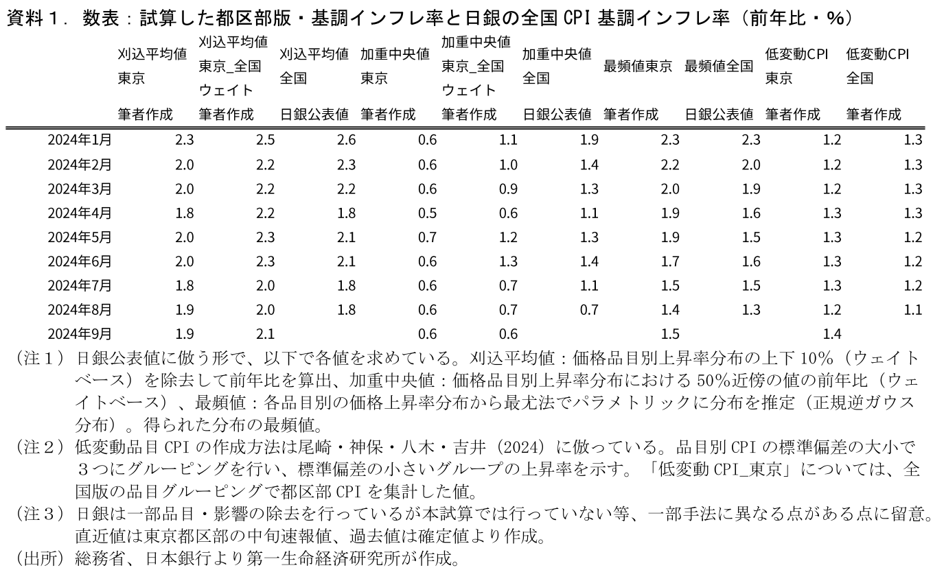 以前のレポートで試算した①東京都区部版の基調的インフレ率3指標、②日銀が賃金から物価への波及度合いを分析する際に利用した低変動品目CPIについて、本日公表の9月都区部CPIを用いて計算した。