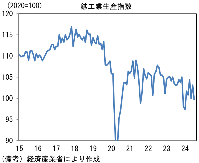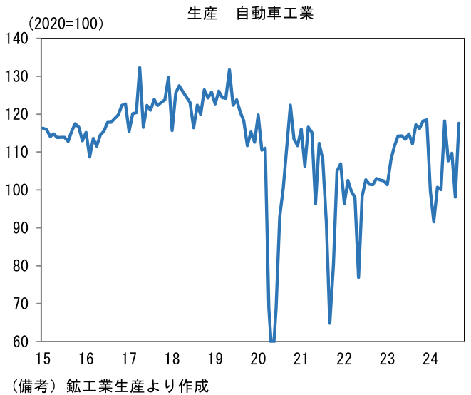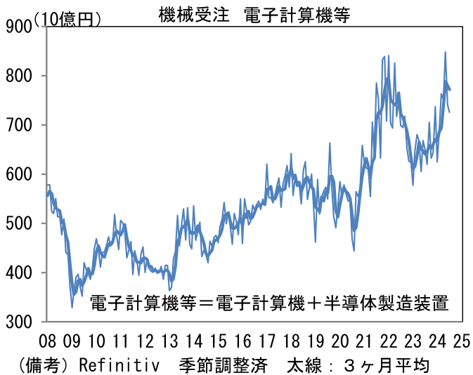 - 鉱工業生産全体の方向感を決める自動車工業は、大手メーカーの工場稼働停止によって1・2月に垂直的落下(累積▲24.0%)を経験した後、大幅な振れを伴い回復傾向にあったが、8月は台風の影響もあって前月比▲10.6%と大幅減産であった。生産水準は、認証不正問題が発覚した2023年10-12月期を約17%pt下回った状態にあり、鉱工業生産全体を下押ししている。需要側に大きな問題が発生していないことを踏まえれば、それだけ増産の余地があると考えて良いだろう(ただし、トランプ氏の掲げる関税が実施されれば国内生産から現地生産への切り替えが進む可能性はある)。自動車と並ぶ重要産業である半導体関連については、電子部品・デバイス工業が同+2.2%と増産傾向を維持。生産用機械に分類される半導体製造装置は同▲18.7%と反動減がみられたものの、先行指標の機械受注統計(機種別集計の電子計算機等)を見る限り、半導体製造装置の引き合いは堅調と思われる。半導体関連の投資が手控えられているといった定性的情報も少ないことから判断すれば、過去数ヶ月の生産減少は一過性の動きと判断される。