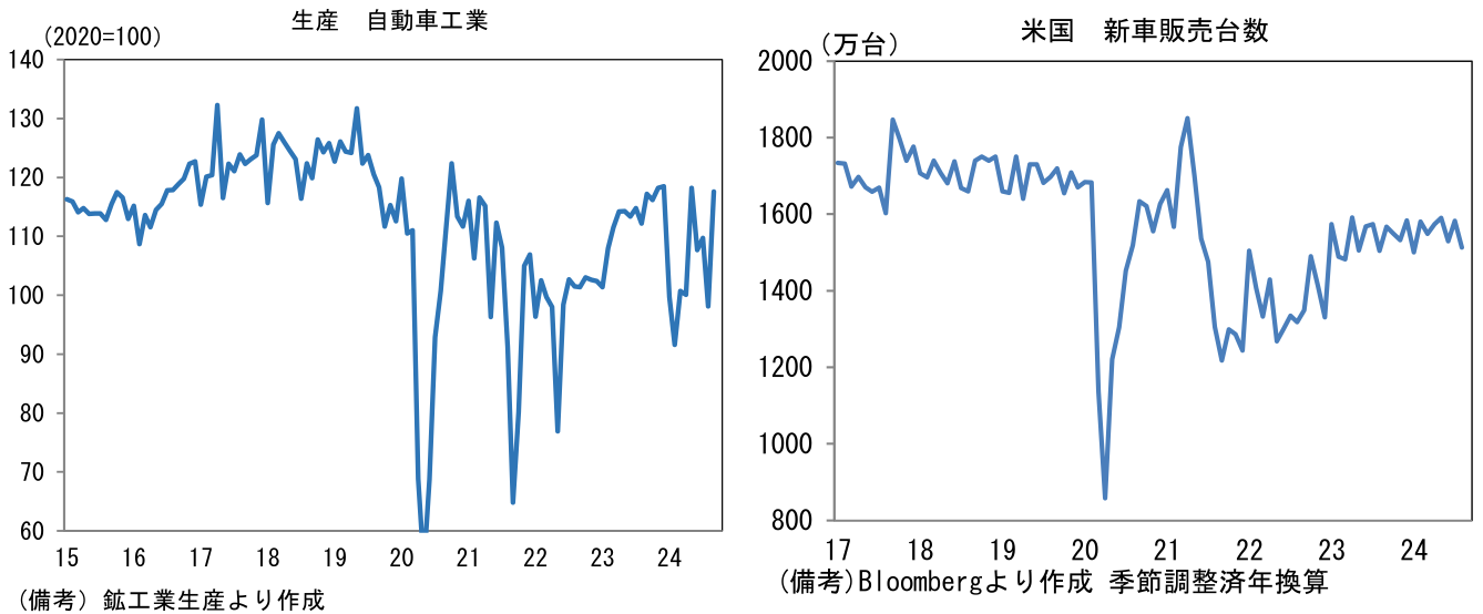 - 8月初旬に実施された生産予測調査に基づけば、製造工業の生産計画は9月が前月比+2.0%、10月が同+6.1%であった。経産省経済解析室が生産予測指数の上振れバイアスを補正した9月の予測値は同+0.3と微増に留まるが、この予測値はこのところの自動車生産の振れを上手くコントロールできていない可能性があり、予測精度が落ちている印象だ。注目の輸送機械工業の生産計画は9月に同+9.2%、10月に同+5.9%と強い。自動車工業は、品質確保を優先する動きから生産台数を抑制する動きが残存しているものの、やや長い目でみれば本格的な工場再開に加え、過去数年の世界的供給制約によって積み上がった潜在需要を背景に息の長い増産が期待できる。自動車ローン金利の高止まりによって販売が頭打ちになっている北米市場では、Fedの利下げが追い風となろう。