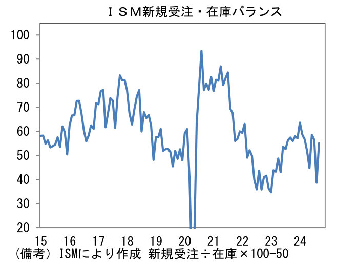 - 9月ISM製造業景況指数は47.2と8月から横ばい、改善を見込んでいた市場予想(47.5)に届かなかった。筆者は9月の地区連銀サーベイが全体として改善を示していたことから、ISMも追随すると見込んでいたので、ヘッドラインの弱さには失望を禁じ得なかった。もっとも、ヘッドラインを構成する5つの項目に目を向けると、明るいデータも内包されていた。5つの項目は生産(44.8→49.8)、新規受注(44.6→46.1)、雇用(46→43.9)、サプライヤー納期(50.5→52.2)、在庫(50.3→43.9)であった。雇用の弱さが気になるところだが、1~3ヶ月の先行きを読む上で有用な新規受注・在庫バランスが55.0へと上昇し、8月の陥没を埋めた点は好感できる。受注の回復と在庫の減少が併存したことは、先行きの生産が持ち直す可能性を高める。