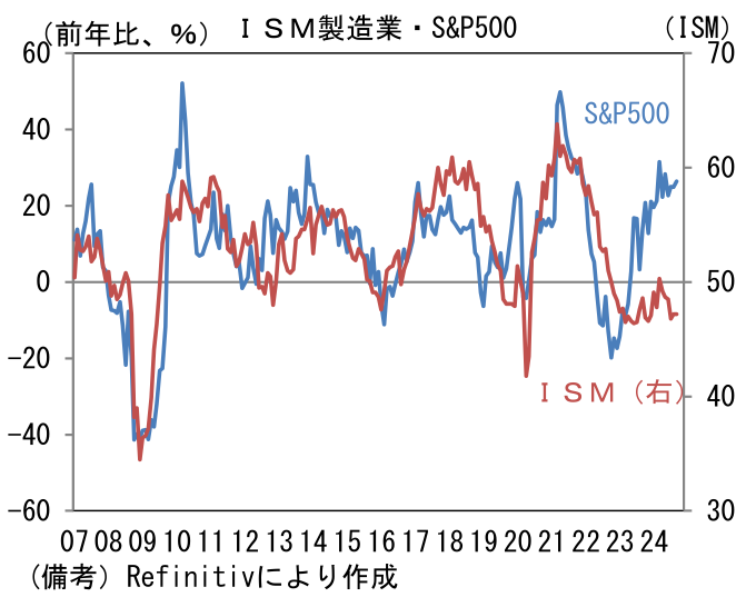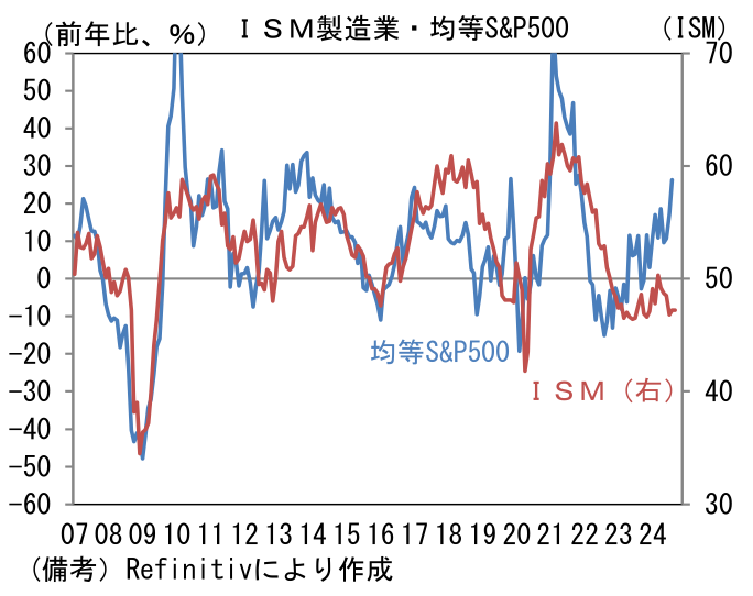 - 最後に、製造業サーベイは長期的にみて株価との連動性が強いことに触れておきたい。S&P500(前年比)とISM製造業景況指数を同じグラフに描いてみると長期にわたる連動性が確認できるが、直近1年程度は明らかな違和感が認められている。ISM製造業が「絶対的に正しい」という前提を置くならば、現在のS&P500は(ひいき目にみても)前年比伸び率がゼロ近傍、すなわち4300~4500程度の水準にあるはずであり、25%程度の下落余地がある。現在の株価はM7と呼ばれる時価総額の大きい非製造業によって牽引されていることを踏まえ、時価総額の影響を受けにくい「均等ウェイトS&P500」と比較しても、やはり違和感は残存する。いずれにせよ現在の株価は、製造業サーベイと整合しない水準にあり、不気味な印象を禁じ得ない。Fedの利下げ期待が株価を押し上げていると理解しているが、このまま企業景況感が停滞すれば、株式市場が大幅な調整を強いられる可能性があることは意識しておきたい。