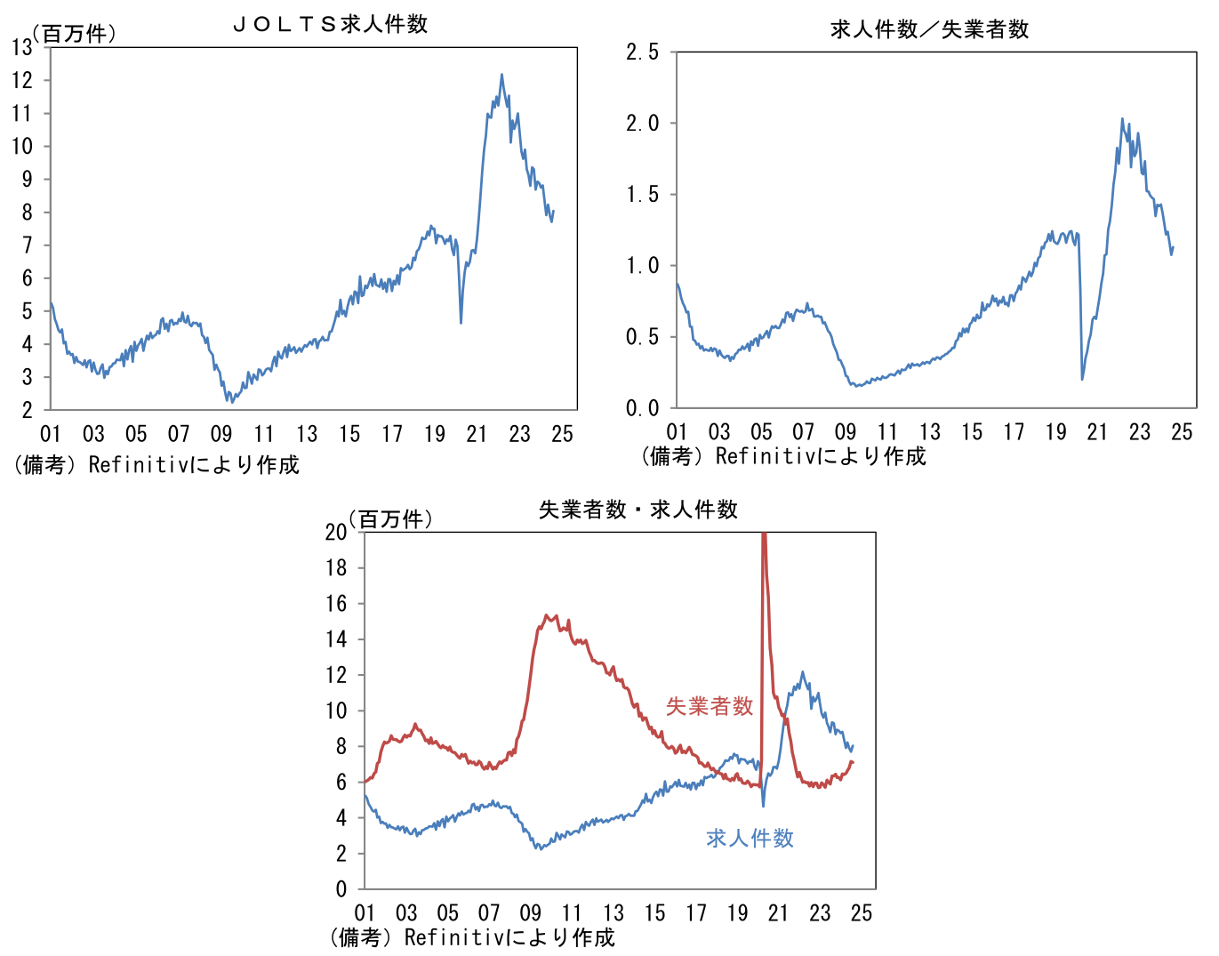 8月JOLTS求人件数は前月比+4.3%、804.0万件。上方修正された7月(767.3万件→771.1万件)から増加し、市場予想(769.3万件)を上回った。直近5ヶ月は800万件程度で推移しており、3ヶ月平均値でも下げ止まった。同時にFedが重視する失業者数に対する求人件数の割合も1.13に反転上昇。移民流入等によって労働力人口が増加していることもあって失業者数が増加する中、求人件数の漸減が重なり同割合は低下してきたが、過去2ヶ月は天候要因もあって急低下を示していたことから8月は反発した。とはいえ、求人件数が失業者数を下抜ける「デッドクロス」は秒読みの段階にあるようにみえる。この点はFedに利下げを促す要因となろう。