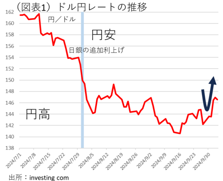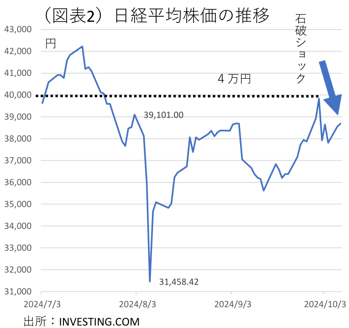 石破首相は、10月2日に「私は個人的には現在、そのような環境にあるとは思っておりません。追加の利上げをするような環境にはありません」と発言した。この首相発言は、2日に官邸で首相就任後に初めて植田総裁と会ったときの状況を踏まえてのものである。ドル円レートは、それまでの円高がこの発言に反応して、一気に1ドル147円台まで戻った(図表1)。10月3日の日経平均株価は、1,000円以上も急騰する場面もあった(図表2)