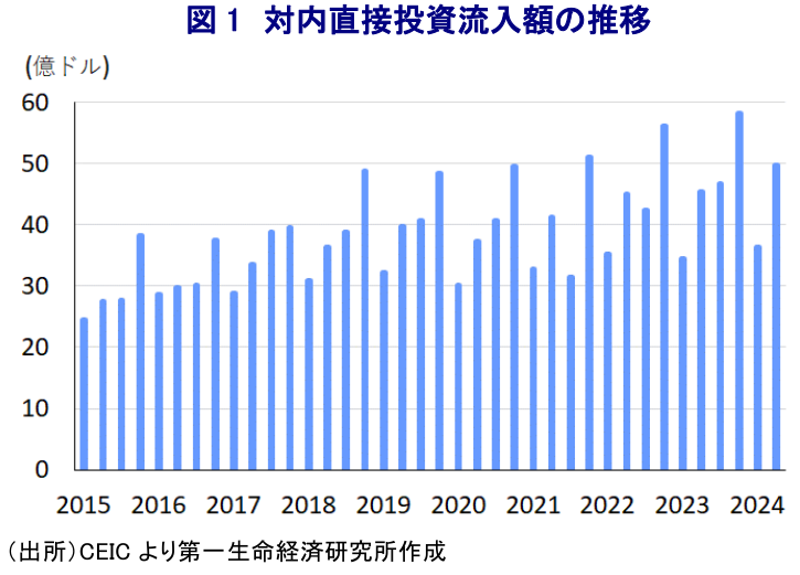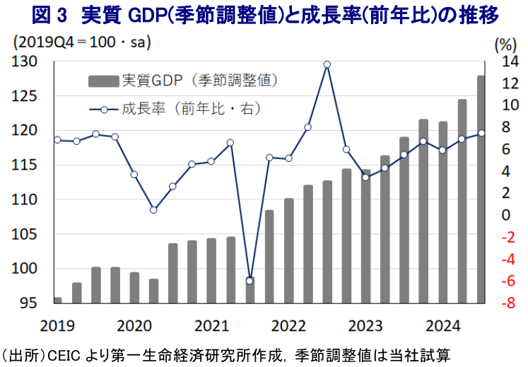 ここ数年のベトナム経済は、サプライチェーンの見直しを受けた対内直接投資の動きが活発化するとともに、外需が景気を下支えする展開が続く。さらに、足下のインフレは前年に加速した反動で頭打ちの動きを強めるなど内需を取り巻く環境も改善している。こうしたなか、7-9月の実質GDP成長率は前年比+7.4%に加速し、当研究所が試算した前期比年率ベースでも二桁成長が続いた模様である。9月の台風被害の影響が懸念されたものの、足下では外需や投資流入の堅調さがその影響を相殺していると捉えられる。