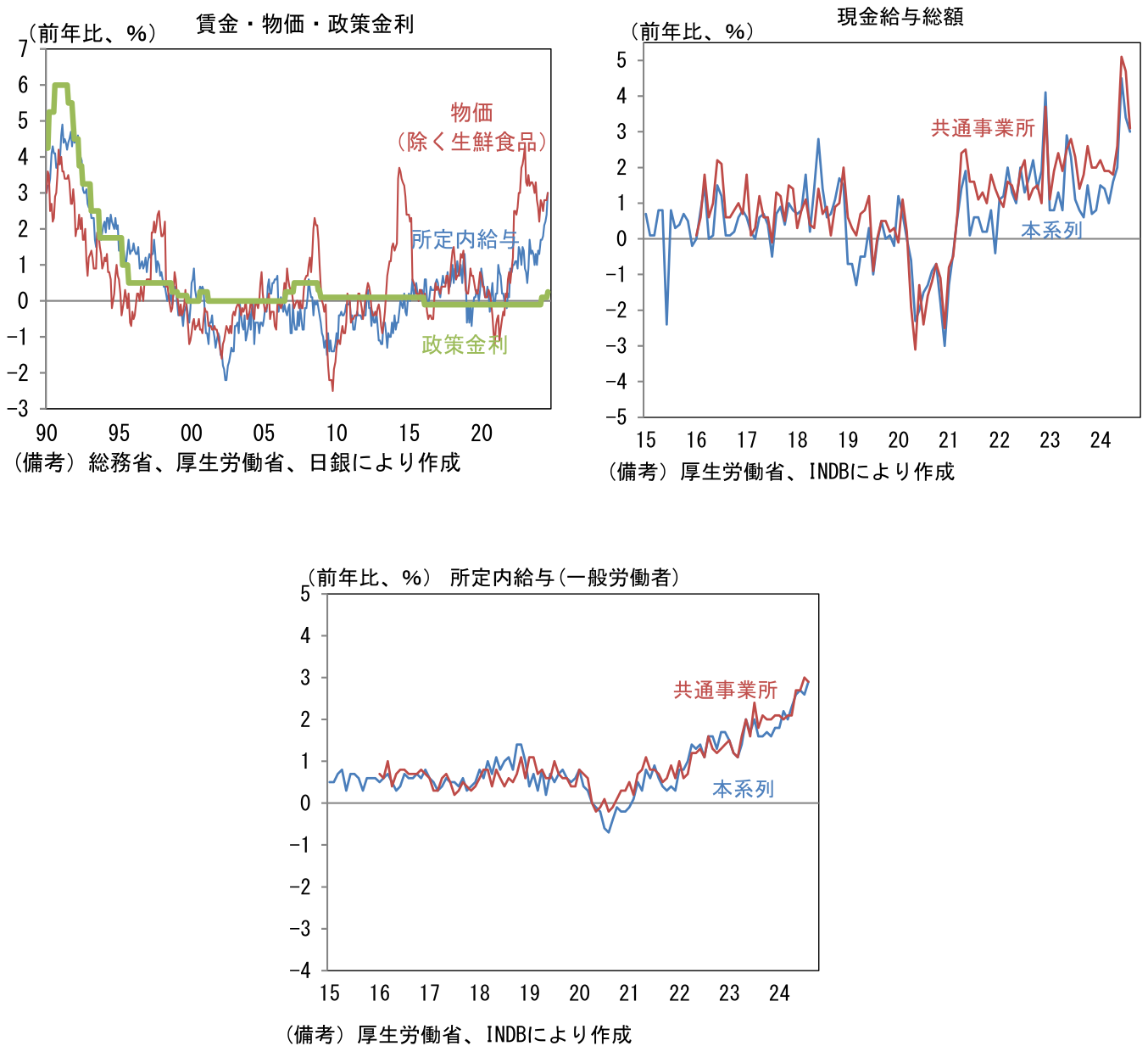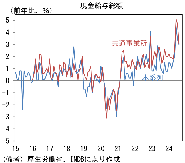 - 本日発表された8月毎月勤労統計(共通事業所版)によると、現金給与総額は前年比+3.1%と強い伸びを示した。特別給与(≒賞与)が同+7.5%と高い伸びを保ったことに加え、所定内給与(≒基本給)が同+2.9%、所定外給与(≒残業代)が同+3.4%と強さを維持した。また賃金の基調を把握する上で重視すべき一般労働者(≒正社員)の所定内給与は前年比+2.9%と高い伸びを維持。7月の同+3.0%から小幅に減速したものの、2022年対比では飛躍的な伸びを記録しており、企業の賃金設定行動が大きく変容した様子が窺える。一般労働者の所定内給与(≒正社員の基本給)は、春闘の結果から判断すると+3.5%程度まで加速しても不思議ではないが、春闘の結果が概ね反映されたとみられる8月分がこの数値だと、そこまでの加速は見込み難い。ただ、いずれにせよ賃上げ率は3%程度かそれ以上の軌道にあり、2%の物価目標に対しては十分な伸びと言える。