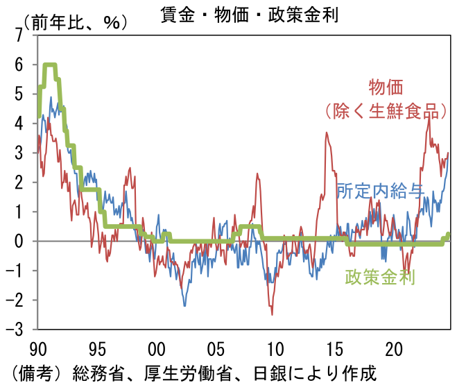 もっとも、来春までという時間軸で考えると、輸入物価の動向にさほど関係なく利上げが実施される可能性が高いとみている。賃上げの定着によってインフレの持続性が高まっているからに尽きる。毎月勤労統計を見る限り、労働コスト増加に起因する内生的なインフレ圧力が強まっていることに疑いの余地はない。1990年代前半に比肩する名目賃金の伸びは、サービス物価の押し上げを通じてインフレの粘着性を高めている。ここで企業向けサービス価格指数に目を向けると、8月は前年比+2.7%と高い伸びが続いている。人件費投入比率別でみると、高人件費率サービスが同+2.8%、低人件費率サービスが同+2.4%と双方とも高い伸びにある。労働集約的な業種(=高人件費サービス)においては、今後も構造的な人手不足が続く下、景気循環に左右されずに価格転嫁が予想される。消費者段階(CPI)のサービス物価は、凍土のごとく動かない帰属家賃の存在によって低い伸びが続いており、実勢を反映していないとの指摘も多いが、少なくとも企業段階においては労働コスト由来のインフレ圧力が、サービス価格の上昇をもたらしている様子が窺える。