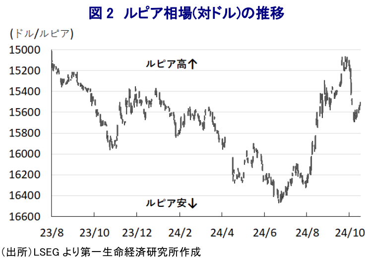 インドネシア中銀は16日に開催した定例の金融政策委員会において、政策金利である7日物リバースレポ金利を2会合ぶりに6.00%に据え置く決定を行った。同行は先月の定例会合において、コロナ禍以降で初めて、かつ3年半強ぶりとなる利下げに舵を切るなど、ここ数年の物価と為替の安定を目的とする利上げ局面は一周した格好である(注1)。なお、インフレ率はコロナ禍一巡による経済活動の正常化に加え、商品高や国際金融市場における米ドル高を受けた通貨ルピア安も重なり、一昨年後半に一時7年ぶりの高水準となる事態に直面した。ただし、中銀の断続利上げに加え、商品高の動きも一巡したことも重なる形でその後は頭打ちに転じるとともに、昨年後半以降は中銀目標域で推移するなど落ち着きを取り戻す動きをみせてきた。こうした状況ながら、その後も国際金融市場においては米ドル高圧力がくすぶるとともに、ルピア相場は調整の動きを強めて輸入インフレが警戒される展開をみせたため、中銀は通貨防衛と目的とする追加利上げのみならず、金融引き締め姿勢を維持せざるを得ない状況が続いてきた。他方、このところの国際金融市場では米FRB(連邦準備制度理事会)による利下げ実施を追い風に米ドル安の動きが強まり、長きに亘って調整局面が続いたルピア相場も一転して底入れの動きを強めるなど輸入インフレに対する懸念が後退したため、中銀の先月の定例会合における利下げ実施を後押ししたと捉えられる。なお、米ドル安の動きを追い風にルピアの対ドル相場は先月末から今月初めにかけて1年強ぶりとなる水準に底入れする動きを強めたものの、その後は米国経済の堅調さが確認されるとともに、米FRBが一段の大幅利下げに動くとの観測が後退していることに加え、中東情勢を巡る不透明感が一層増すなかで国際原油価格は底入れの動きを強めており、原油の純輸入国であるインドネシアにとっては対外収支の悪化と物価上昇を招くとの懸念が高まり、ルピア相場は一転して頭打ちの動きを強める状況に直面した。また、このところのルピア相場を巡っては、今月20日に発足するプラボウォ次期政権の財政運営に対する不透明感がくすぶっていることも影響を与えている可能性もある(注2)。よって、中銀は先月の定例会合での利下げ決定に際して追加利下げに含みを持たせる考えをみせたものの、その後のルピア相場を取り巻く環境変化を受けてシナリオの見直しを余儀なくされたと捉えられる。会合後に公表した声明文では、国際金融市場を巡って「主要国における金融政策の動向や中東情勢を巡る地政学リスクの高まりを受けて不確実性が再燃している」との認識を示している。他方、同国経済については「堅調な推移をみせており、内需をけん引役にした拡大が見込まれる」として「今年の経済成長率は+4.7~5.5%」、対外収支についても「健全な推移が続いて安定さも維持されている」として「今年の経常赤字はGDP比▲0.9~▲0.1%」とともに従来見通しを維持している。他方、ルピア相場については「中銀による政策的なコミットメントを反映して安定が図られたが、地政学リスクを受けた金融市場の動揺の余波を受けた」としつつ、「フィリピンペソや台湾ドル、韓国ウォンに比べて小幅な調整に留まった」との認識を示すとともに「先行きは安定を見込んでおり、政策対応を強化する」との考えを示す。そして、物価動向については「目標域内での推移が見込まれる」との見方を示している。なお、会合後に記者会見に臨んだ同行のペリー総裁は、米FRBの政策運営について「年内に2回、来年には3~4回のいずれも25bpの利下げを見込む」との見方を示すとともに、「米FRBによる利下げの動向や中東を巡る地政学リスクに注意を払う必要がある」との認識を示している。他方、政策運営について「安定と成長を重視する上で何も変わっておらず、追加利下げのタイミングと度合いについてはデータ次第」としつつ、「ルピア相場が強含みしつつ安定するとの見方を信じている」との認識を示している。その上で、新たな政策対応として「来年1月から流動性供給を巡るインセンティブ付与に動く」とした上で「農業や製造業、貿易など雇用拡大に資する分野を対象に信用拡大を促す方針を示す」としている。そして、「政府と協調しつつ、政策運営を巡っては独立した判断を下す」と述べるなど、市場が警戒する中銀の独立性をあくまで重視する考えを示した格好である。よって、当面の政策運営は引き続き外部環境次第の展開が続くことは避けられそうにないと予想される。