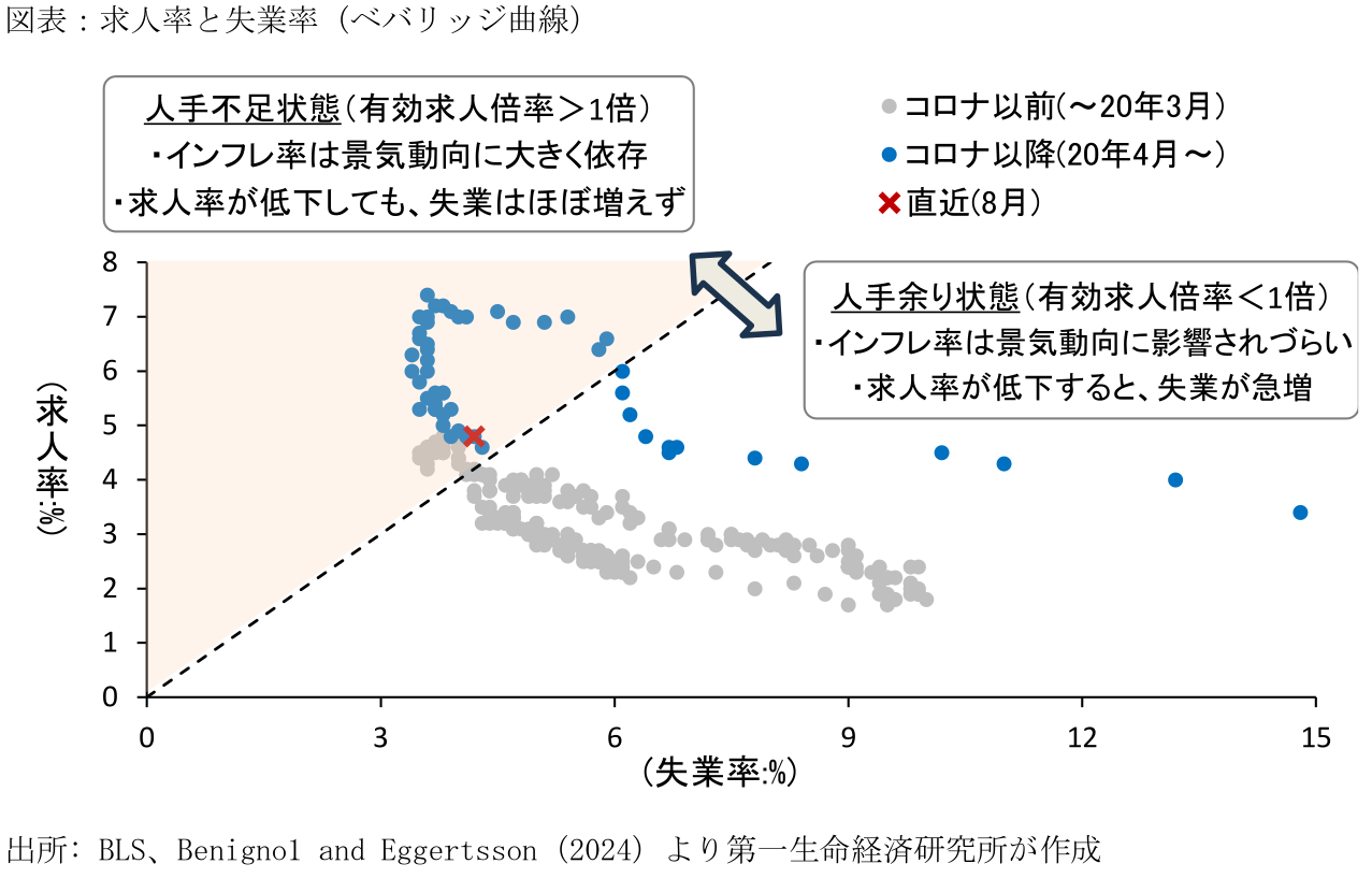 ちなみにコロナ以前の過去3回の景気後退において、利上げ打ち止めから景気後退に陥るまでの期間は11-19か月であり、景気悪化時には失業率が急速に悪化する傾向にある(詳細は「米国経済マンスリー:2023 年12月」)。今次利上げ局面の終了は2023年9月であるため、2025年初までに累積的な利上げによる設備投資や新規雇用への影響が急速に発現し、景気後退へと陥る可能性は否定できない。足下では、振れを伴いながらも、賃金の減速と共に求人倍率(=求人数/失業者数)の低下がみられるなど、雇用市場の過熱感が解消しつつあるなかで、失業率が急上昇するリスクに警戒が必要だろう。