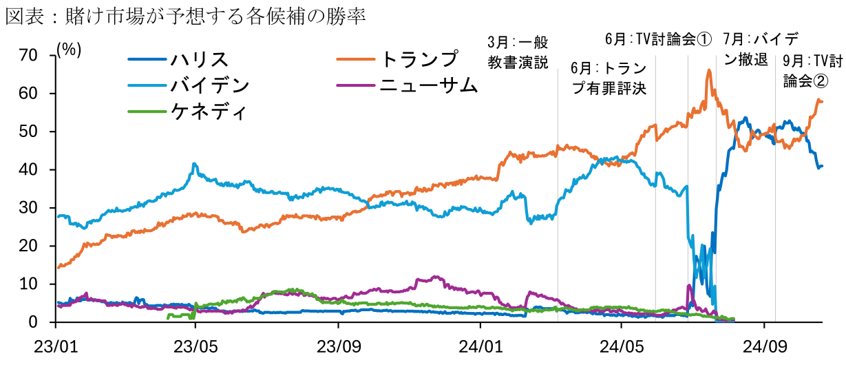 なお、過去の大統領選においては、10月に想定されなかったイベントが生じ、選挙情勢を大きく変化させたことがあった(オクトーバーサプライズ)。例えば、2004年選挙では10月30日にビンラディンが同時多発テロへの関与を認めるビデオ声明を発表し、テロとの戦いを掲げていた現職のブッシュ大統領の追い風となった。2016年には10月28日にコミーFBI長官(当時)が民主党・クリントン候補の私用メール問題(国務長官時代に私用メールを用いて機密情報をやり取り)の調査を再開すると発表し、トランプ氏が圧倒的な劣勢との事前予想を覆し勝利した。また、こうした政治的なイベントのみならず、2012年は10月下旬に米東部に上陸したハリケーン「サンディ」への災害対応が、現職オバマ大統領の再選をサポートしたとみられている。2024年選挙もこうしたオクトーバーサプライズによって選挙情勢が大きく変化する可能性があり、選挙戦は投開票日まで予断を許さない状況が続きそうだ。