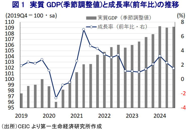 韓国経済を巡っては、近年の社会経済格差の拡大に加え、コロナ禍を経た生活様式の変化も重なり、昨年の合計特殊出生率は0.72と8年連続で過去最低を更新する展開が続くなど、急速な少子高齢化が進展している。さらに、ここ数年の韓国国内においては、コロナ禍一巡による経済活動の正常化に加え、商品高や通貨ウォン安による輸入インフレも重なりインフレが上振れし、中銀は物価と為替の安定を目的に累計300bpもの利上げに動くなど、内需を取り巻く環境は厳しさを増してきた。他方、最大の輸出相手である中国との関係が悪化するとともに、北朝鮮を巡る地政学リスクの高まりといった外需を取り巻く環境も不透明感が増す事態に直面している。このように、足下の韓国経済は内・外需双方に不透明要因が山積する状況にあるなか、4-6月の実質GDP成長率はマイナス成長に陥るなど躓きが確認されたものの、7-9月については前期比年率+0.54%と2四半期ぶりのプラス成長に転じるも勢いを欠く推移が続いている。中期的な基調を示す前年同期比ベースの成長率に至っては+1.5%と前期(同+2.3%)から一段と鈍化して4四半期ぶりの1%台となるなど、足下の景気は頭打ちの動きを強めている様子がうかがえる。足下のインフレ率は前年に加速した反動で頭打ちの動きを強めるなど落ち着きを取り戻しているものの、韓国はアジア太平洋地域のなかでも家計債務の水準が比較的高く、中銀による高金利政策の長期化を受けた債務負担の増大が家計消費の足かせとなる展開が続いている。さらに、外需を取り巻く不透明感の高まりに加え、高金利政策の影響も重なり企業部門による設備投資のほか、家計部門による不動産投資は力強さを欠く動きをみせており、民間需要を中心とする内需の弱さが景気の足を引っ張っている様子がうかがえる。そして、輸出についても外国人来訪者数の堅調さがサービス輸出を下支えするも、財輸出の低迷が輸出全体の重石となるなど外需の弱さも景気が頭打ちの動きを強める一因になっていると捉えられる。一方、予算進捗の動きを反映して政府消費は堅調な動きをみせるとともに、公共投資が拡大している動きは固定資本投資を下支えしており、足下の景気は公的需要への依存度を強めていると捉えられる。分野別の生産動向についても、農林漁業関連や公益関連の生産が大きく上振れする動きが確認される一方、製造業や建設業、サービス業などで軒並み生産が力強さを欠く動きが確認されるなど内・外需の低迷が生産活動の足かせになっている様子がうかがえる。なお、公的需要の堅調さを反映して輸入が拡大していることを受けて、純輸出(輸出-輸入)の成長率寄与度は前期比年率ベースで▲2.68ptとなるなど景気の重石となっている一方、在庫投資による成長率寄与度は同+1.04ptと2四半期連続のプラスで推移しており、足下の景気は力強さを欠く一方で在庫の積み上がりが確認されるなど、景気実態は数字以上に悪化しているものと捉えられる。中銀は、今月の定例会合において今年通年の経済成長率を+2.4%との見通しを示しているものの、9月までの累計ベースの成長率は+2.3%とこれを下回る伸びに留まるなど厳しい状況にある。