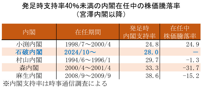 しかし、石破内閣発足後最初の世論調査では、支持率が28%(時事通信調べ)と、2000年以降の新内閣発足後の最初の調査としては最も低い水準となった(1991年発足の宮澤内閣以降では、1998年に発足した小渕内閣の24.8%に次ぐ)。本シリーズ「Investment Navigator-18 内閣支持率と株価(24/10/2)」でも触れたが、発足時の支持率が高い内閣ほど、就任中の株価のパフォーマンスが良い傾向にあることから、石破内閣での今後の動向が注目される。