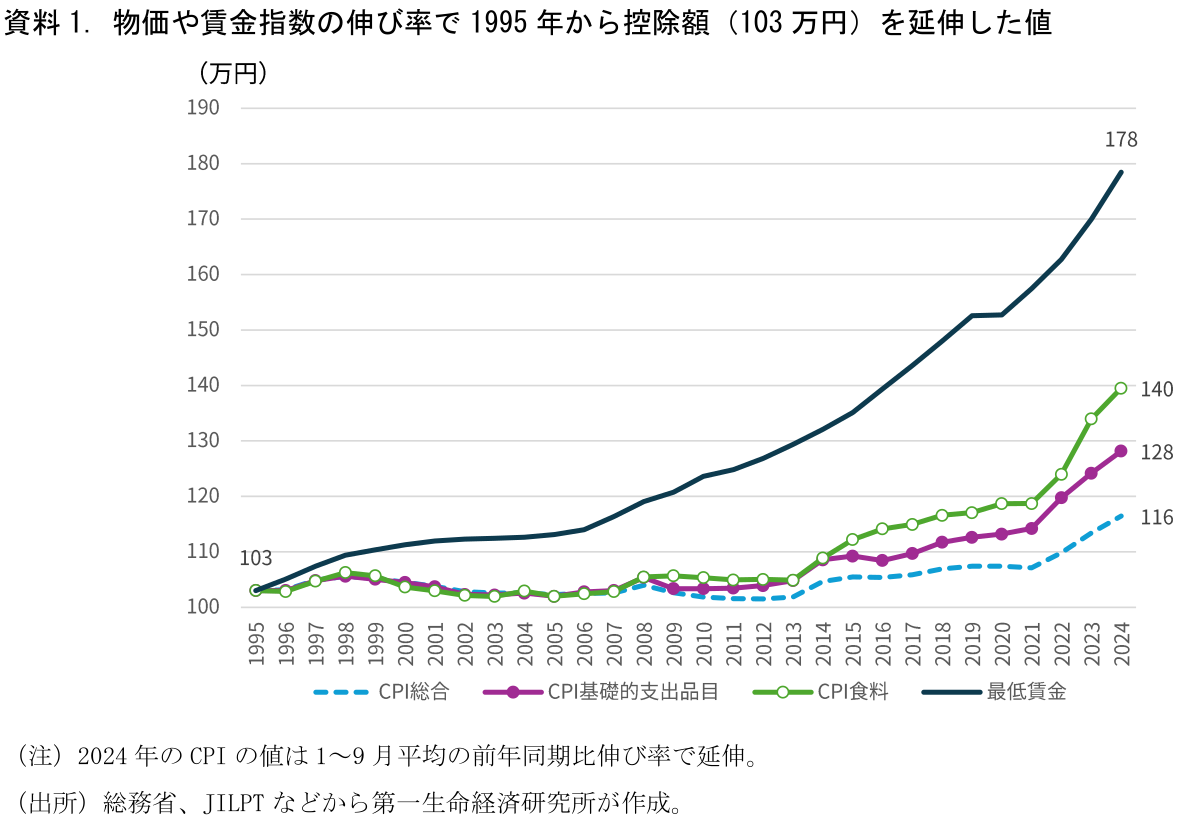 では最低賃金に代わる指標は何か。基礎控除は必要最低限の生活費には税を課さないという考えの下で設定されている。この点で、最低賃金よりも消費者物価の伸び率を当てるべきとの考え方はまず思いつくものだ。この場合には1995年から2024年までの累積物価上昇率は1割強程度にとどまる(2024年分は1−9月の伸び率で延伸)。これに基づくと、「103万円→116万円」への引き上げが正当化されるが、最低賃金をベースとした178万円とは相当な乖離が生じることになる。