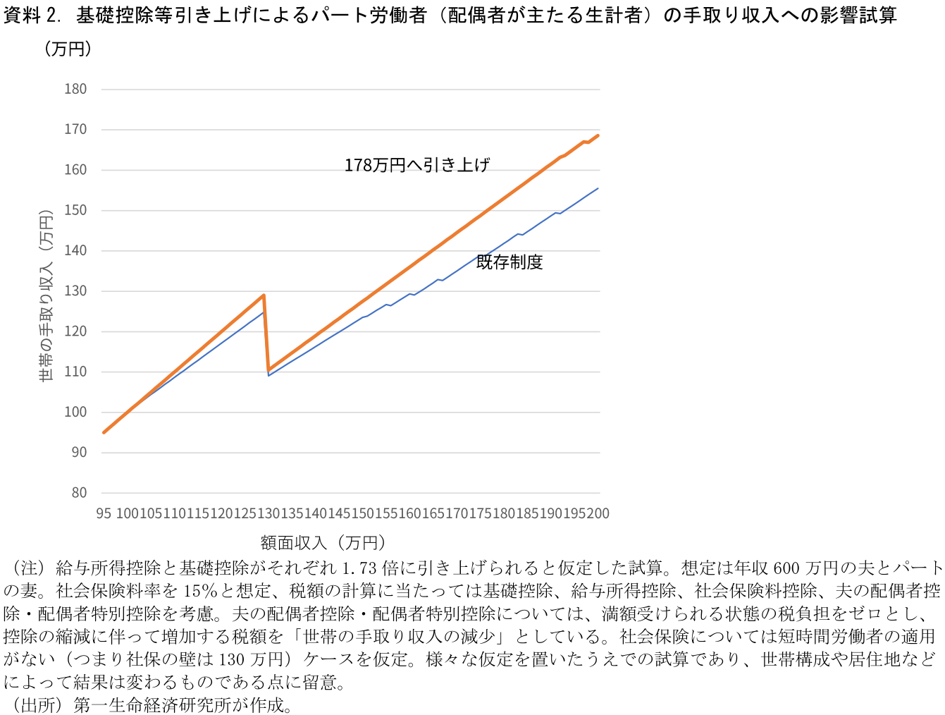これは、年収の壁問題に幾分のポジティブな効果をもたらす。「年収の壁を気にして130万円未満に収入を抑えていた人が、130万円を超えて同等あるいはプラスαの手取り収入を得るために必要な額面収入」が少なくなるのである。資料2の仮定に基づくと、例えば既存制度では「年収129万円時点の手取りを得るために必要な額面年収」は153万円となる一方、控除引き上げ後は152万円になる。また、「年収129万円時点の手取り“+10万円”を得るために必要な額面年収」は既存制度では170万円であるのに対して、控除引き上げ後は164万円である。