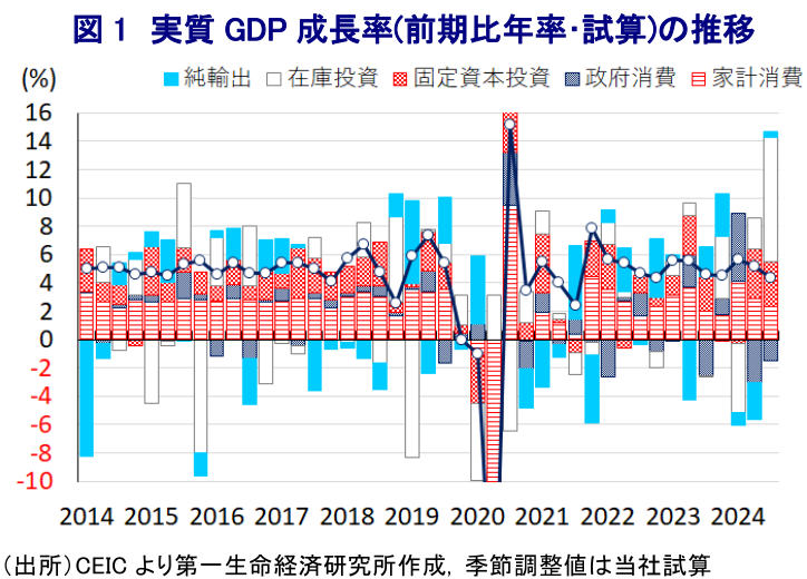 - インドネシアでは先月プラボウォ政権が発足した。同政権はジョコ前政権の路線を継承しつつ、任期中の経済成長率を8%程度に大きく押し上げる方針を掲げるが、そのハードルは高いのが実情である。なお、7-9月の実質GDP成長率は前年比+4.95%、当研究所が試算した季節調整値に基づく前期比年率ベースでも鈍化するなど、前政権末期の景気は頭打ちしたと捉えられる。ただし、需要項目別ではインフレ鈍化を受けて家計消費は堅調な推移をみせるほか、設備投資需要や新首都建設が投資を押し上げるとともに、外需の堅調さも確認されている。内需は民間需要を中心に拡大が続くなど内容は決して悪くないと捉えられる。他方、足下のインフレは落ち着いた推移をみせるが、異常気象の影響で農林漁業関連の生産は下振れするなど供給懸念がインフレ圧力を招く可能性はくすぶる。さらに、金融政策はルピア相場の動向に揺さぶられるなど中銀は難しい対応を迫られている。プラボウォ政権が成長率に拘泥して財政出動への依存を強めれば新たな弊害を招くリスクもあり、高望みし過ぎず堅調な経済成長の実現を目指すことが望まれよう。
