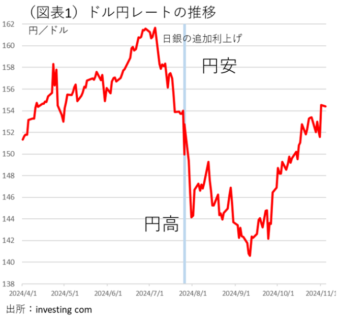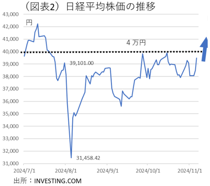 市場の反応は、大幅な円安・株高である(図表1、2)。トランプ次期政権でインフレが加速するという予想の下、企業業績と長期金利が上がるという読みからだ。11月のFOMCでは追加利下げが予想されるのに、ドル高・円安というのは選挙要因の方が遙かに大きく効いているということだ。