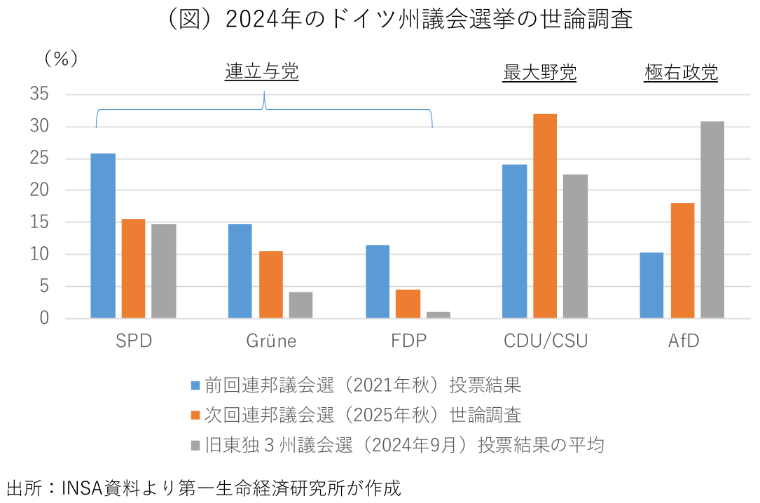 各種の世論調査では、連立与党の支持率低迷が続いており、CDU/CSUによる政権奪還が確実視されている(図)。CDU/CSUは最近、CDUのメルツ党首を首相候補とすることを決め、メルケル元首相のライバルであった同氏の次期首相就任が有力視される。CDU/CSUの単独過半数獲得は困難な情勢で、連立相手として考えられるのは、SPD、緑の党、新興左派政党「ザーラ・ワーゲンクネヒト同盟(BSW)」の3党だろう。過去に連立を組んだことがあるFDPは議席獲得に必要な得票率5%に届かない可能性が高く、CDU/CSUは極右政党「ドイツのための選択肢(AfD)」との連立も否定している。支持率が低迷するSPDや緑の党が党勢回復を優先して政権参加を見送る場合、旧東ドイツの支配政党の流れを汲むBSWが唯一の連立相手となる。9月に旧東ドイツの3州で行われた州議会選挙ではAfDとBSWが躍進、州政府の発足に向けた連立協議で、主要政党はAfDとの連立を拒否した一方で、BSWとの連立協議を開始している。親ロシアのBSWが連立に加わる場合、ウクライナ支援の行方が不安視される。