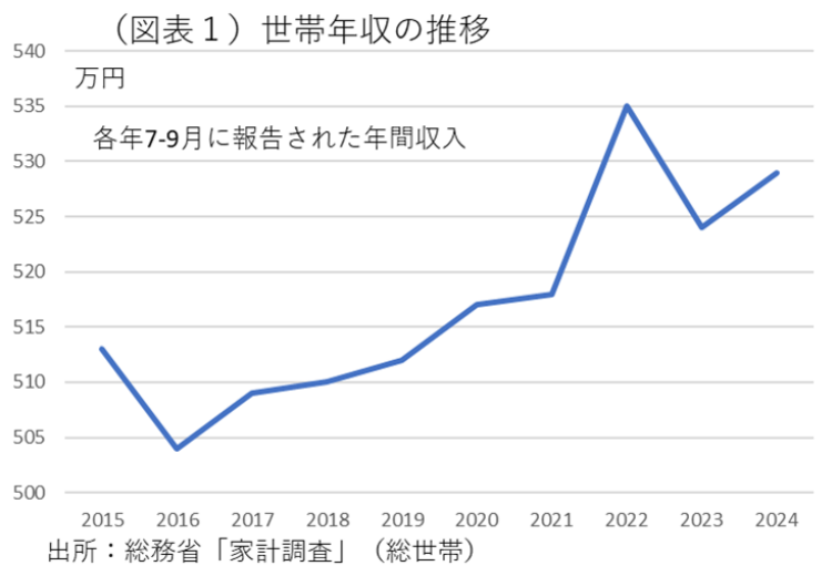 では、どうして年金生活者を念頭に置いて給付金がばらまかれるのか。第一に、日本の世帯全体に占める年金生活世帯が意外と多いことがある。直近データまで使える総務省「家計調査」(総世帯、2024年7~9月)を調べると、無職世帯の割合は37.37%を占めていた。賃上げの恩恵を受けられる勤労者世帯は53.53%と約半分だ。賃上げの恩恵が及ばない無職世帯≒年金生活世帯とすると、4割近くに達する。その年間収入は307万円と、勤労者世帯の656万円に比べて半分以下だ(同じく「家計調査」)。