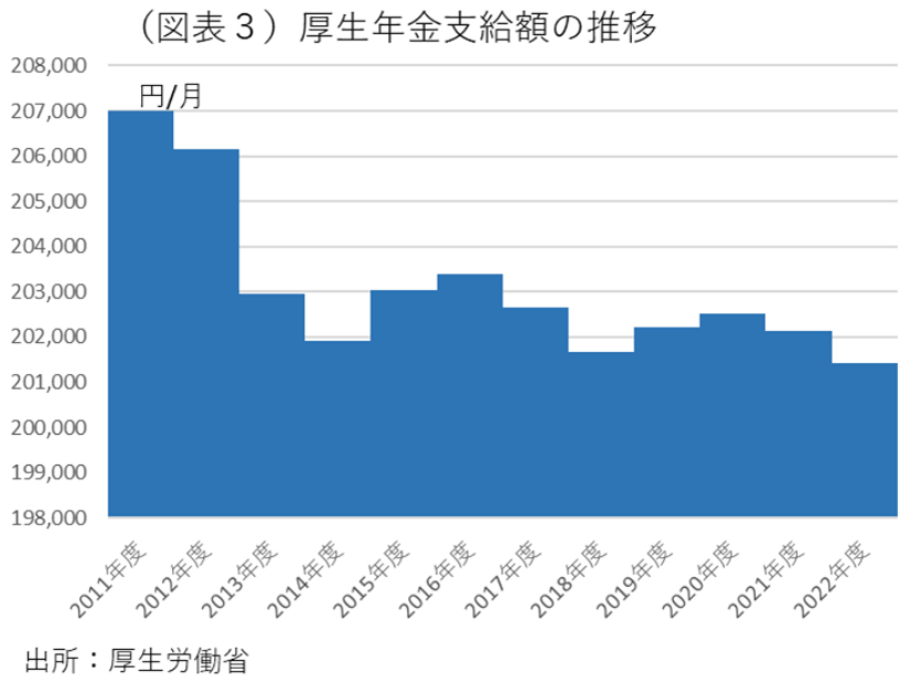 だがそれならば、年金制度での対応が本筋のはずだ。なぜ、年金の給付額を増やせないのだろうか。公的年金には、消費者物価と賃金の上昇率に応じて給付額を連動させるスライド方式が採用されている。しかし、2004年の年金改革によって、現役世代の人口減少などを反映させて給付水準を実質的に切り下げていくマクロ経済スライド制が導入されていて、物価にスライドする上昇幅を抑える仕組みになっている。この調整は、現役世代の給与水準(手取り)の50%まで年金支給開始時の年金金額を減らしていくところまで行われる(2024年度61.2%)。このように年金支給額が伸びにくい構造になっていると、年金生活世帯は物価上昇に対して脆弱な環境に置かれてしまう。過去、2004年の年金改革のことを年金財政の改善で「100年安心」などと言われたが、その実態は年金生活者の所得環境を追い詰めるものになっていたと言える。厚生年金の支給額の実績を確認すると、確かに過去10年以上ほとんど増えていなかった(図表3)。