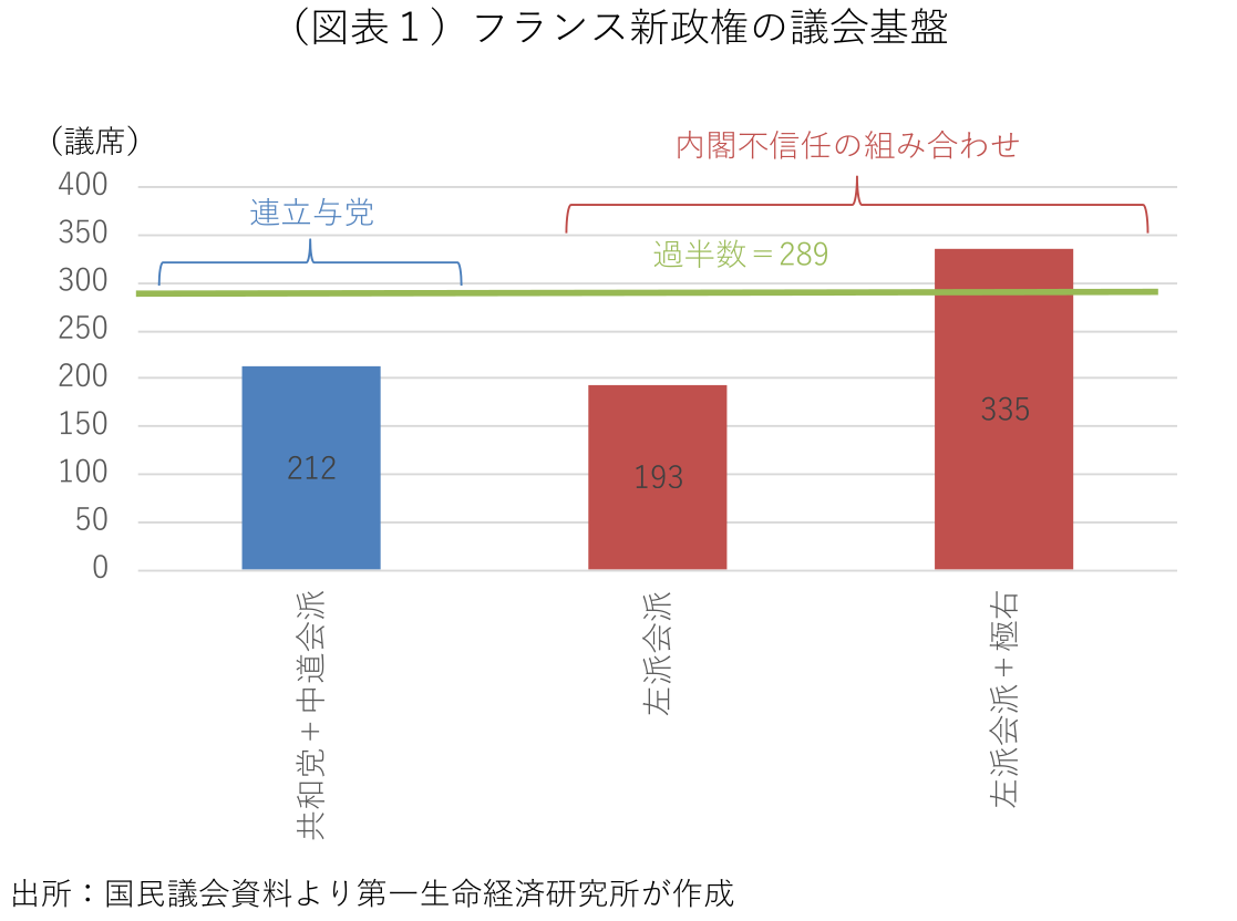 内閣不信任案が可決された場合、マクロン大統領は新たな首相を任命することになる。左派勢力の切り崩しに成功すれば、極右と極左を排除する形での中道政権が誕生し、現政権よりも議会基盤が安定化する。左派の切り崩しに失敗する場合、中道右派の「共和党」とマクロン大統領を支持する中道会派「アンサンブル」が協力する現政権の枠組みが維持されよう。6・7月の国民議会選挙後、バルニエ首相を任命するまでに要した時間と会派間の難しい調整を考えると、年内の暫定予算の成立を優先し、バルニエ首相を再任する可能性もある。米国型の政府閉鎖を回避するため、来年度の税徴収を可能にする特別法の議会承認を進め、政令で政府歳出を配分することになるが、議会で承認されていない新たな税徴収や歳出は認められない(憲法47条)。つまり、今年度の予算が来年度予算に引き継がれる。特別法の議会承認が難しい場合、大統領は公的機関の適切な機能中断時に必要な措置を講じる大統領権限(憲法16条)を発動する可能性がある。