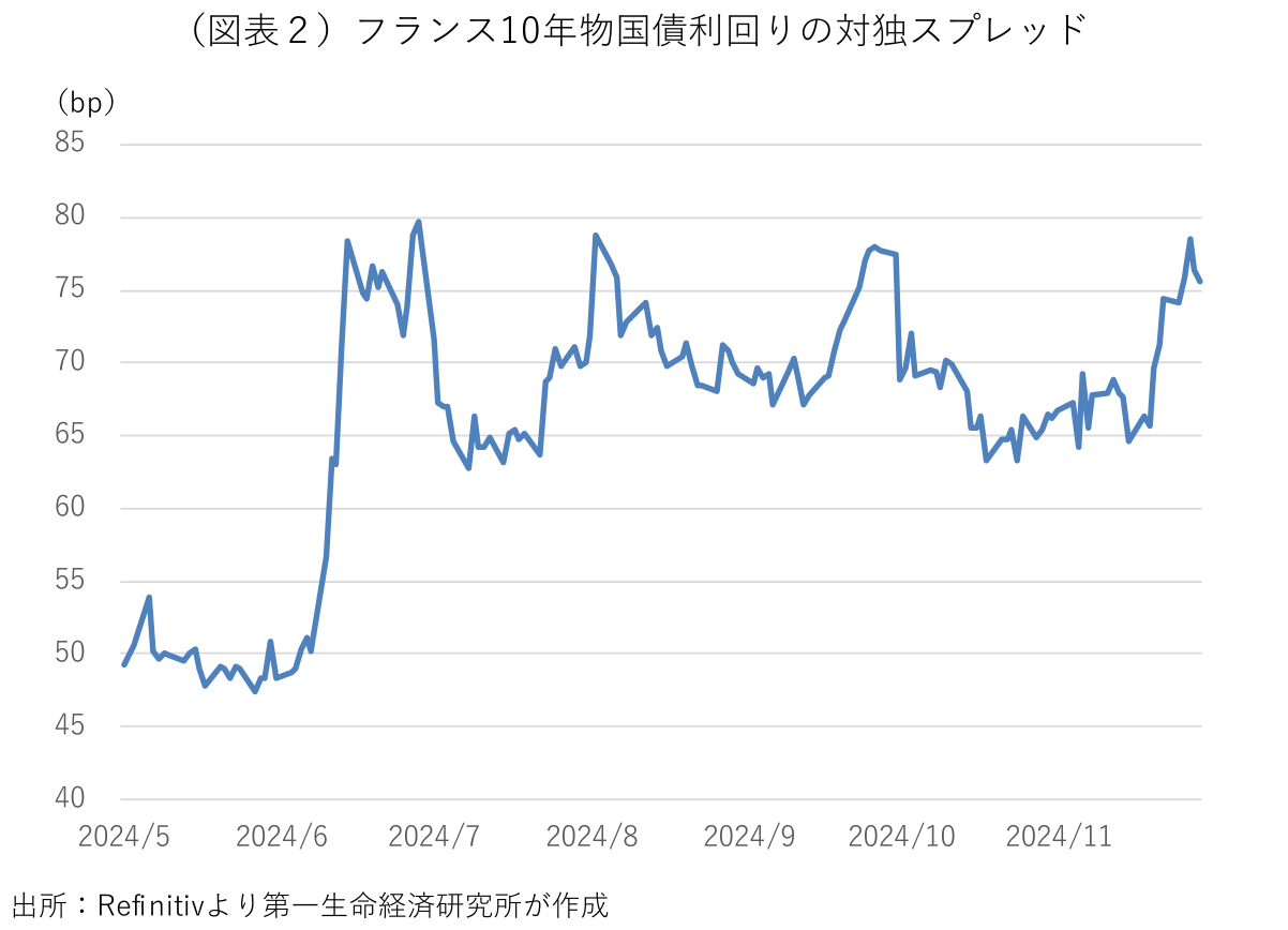 フランスで9月に発足したバルニエ政権の命運を賭けた予算審議が佳境を迎えている。国民議会(下院)で過半数の議席を持たない同政権は、来年度予算案の年内可決を目指し、12月中に予定される3つの関連法案の最終審議で、憲法49条3項に基づく特別な立法手続きを利用する方針だ。同手続きでは、法案に関する議会採決を回避できる一方、議会は対抗措置として24時間以内に内閣不信任案を提起することが可能で、不信任となった場合は内閣が総辞職し、信任された場合には当該法案が可決されたと見做される。議会の最大勢力である左派勢力「新人民戦線」は、政府が議会採決を迂回して予算通過を目指す場合、内閣不信任案を提起する方針を固めており、極右政党「国民連合」がこれに同調する可能性を示唆している。左派勢力だけでは政権を倒すのに必要な議席を持たないが、極右勢力の議席を合計すると、不信任案の可決に必要な過半数を上回る(図表1)。不信任案が可決されれば、内閣は総辞職し、来年度予算案も廃案となる。俄かに再浮上したフランスの政治・財政リスクを受け、フランスの国債利回りが急上昇し、域内の安全資産とされるドイツ国債との利回りスプレッドが一時、欧州債務危機時以来の水準に拡大した(図表2)。