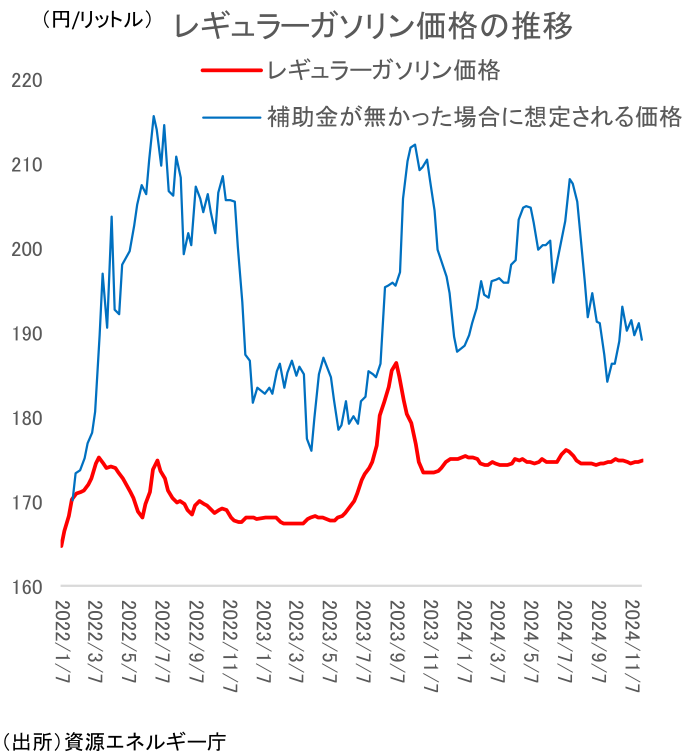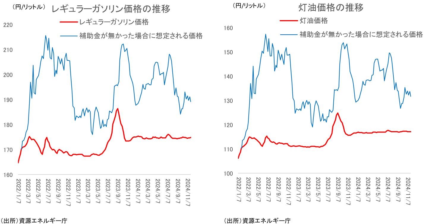 年内終了予定だったガソリン補助金の延長が決まった。もっとも、12月以降段階的に補助が縮小する形での延長であるため、ガソリン価格は現在よりも上昇する。足元で補助金により1リットルあたり175円程度に抑えられているガソリン価格は、24年12月19日以降には180円程度、25年1月16日以降は185円程度に上昇する見込み。その後についても、月当たり5円程度補助金が減らされていく方向で検討されており、25年2~3月頃には補助が実質的に終了する可能性がある。
