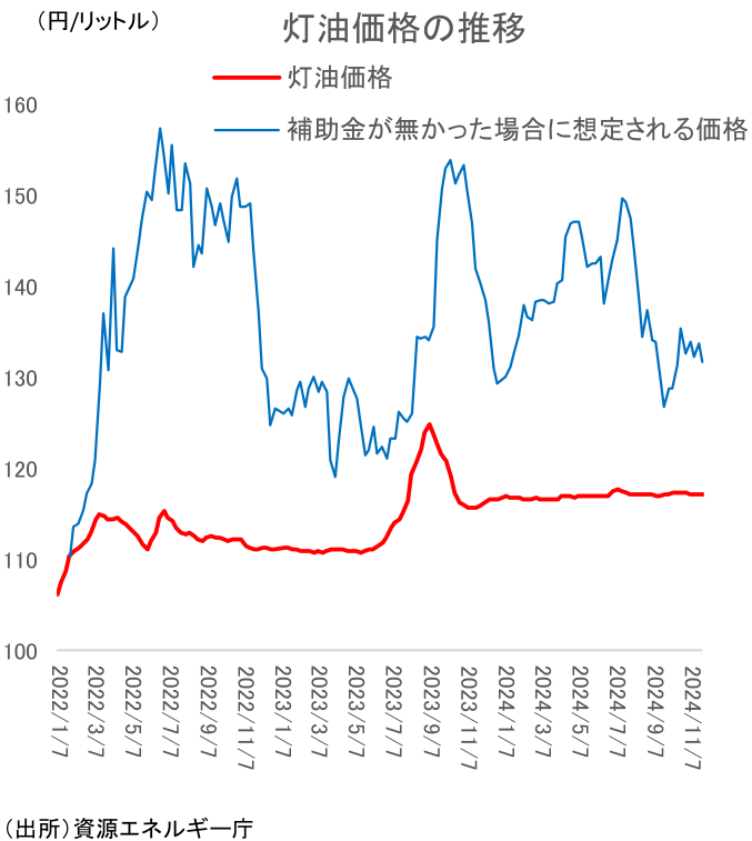 ガソリン・灯油価格上昇に対する国民の拒否反応は大きいため、12月19日以降に予想されるガソリン・灯油価格の上昇については批判が出ることが予想される。実際、23年6月に補助金が段階的に縮小されたことがあったが、この時大きな批判が巻き起こった結果、補助金が再度拡大されたということもあった。また、ガソリンもさることながら、灯油についても問題は大きい。これから冬が本格化し、暖房需要が急増するなか、灯油価格の上昇が寒冷地の消費者負担増加につながることが予想される。