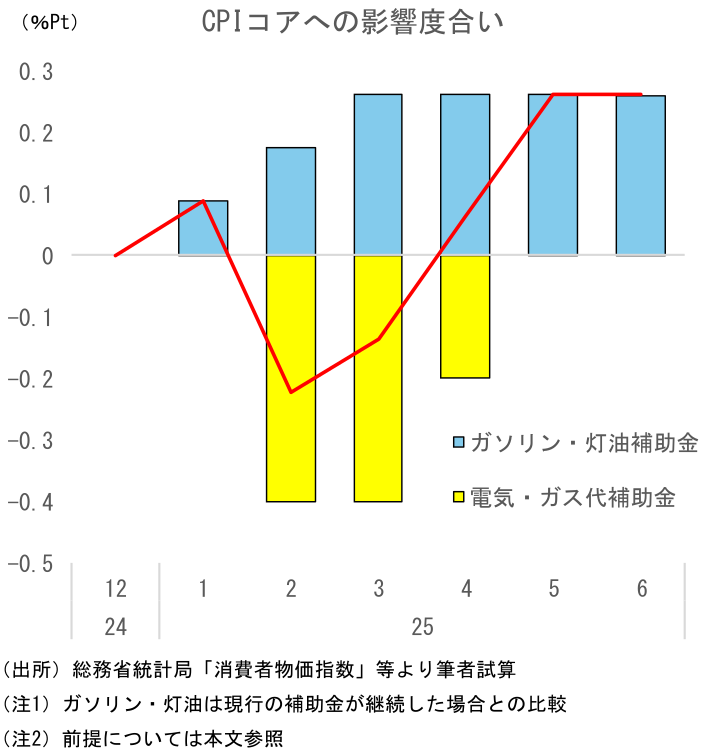 ガソリン補助金の縮小により、補助が現行のまま延長されたケースと比較して、CPIコアは25年1月に+0.09%Pt、2月に+0.18%Pt、3月以降は+0.27%Pt押し上げられると試算される。