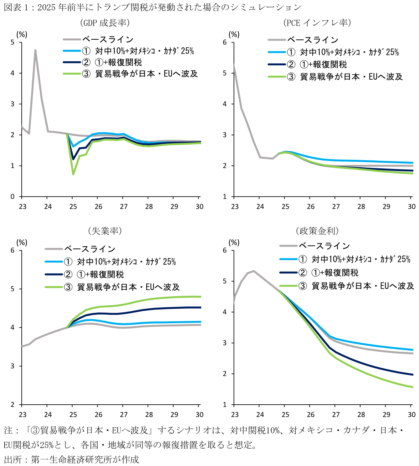 本シミュレーションには幾つかの留意点がある。まず、追加関税による輸入の価格弾力性を1と仮定しているが、実際の弾力性は輸入品目ごとに多様であり、産業ごとにその影響度は大きく異なる可能性が高い。特に貿易摩擦の激化を背景に特定の財の調達が困難となる場合、景気への影響が増幅する懸念が強いほか、先行きの不確実性が株式を中心とした金融市場の混乱へと繋がるリスクがある。一方、上記試算に対する上振れリスクとして、こうした関税はGDP比で最大1.5%前後の増収を招く可能性があり(注4)、こうした財源が米国内の生産回帰に対する補助金として用いられる場合、中長期的な経済への影響は幾分緩和されることが見込まれる。また、トランプ関税が長期的に撤回されない前提を置いているものの、経済・物価への悪影響が顕在化する場合、トランプ新大統領は政策の修正を強いられる可能性が高い。