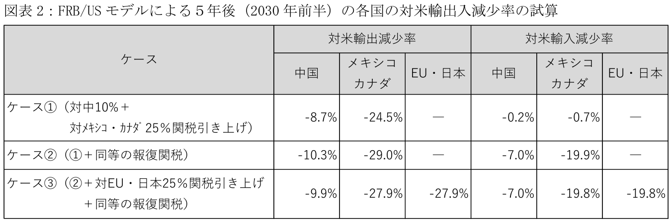 まず、①対中輸入に10%、かつ対メキシコ・カナダの輸入に25%の関税引き上げを実施するケース、②こうした米国の関税措置に中国・メキシコ・カナダが報復措置として同等の関税引き上げを実施するケース、そして、③25%の関税引き上げがEU・日本にも拡大され、EU・日本も報復措置として同等の関税引き上げを実施するケースに関して、FRB/USモデルによる米国の輸出入減少率のシミュレーション結果を用いて、5年後(2030年前半)の各国の対米輸出減少率、対米輸入減少率(実質ベース)を試算した(注6)。それぞれの対米貿易における輸出入の減少率は図表2のとおりである。