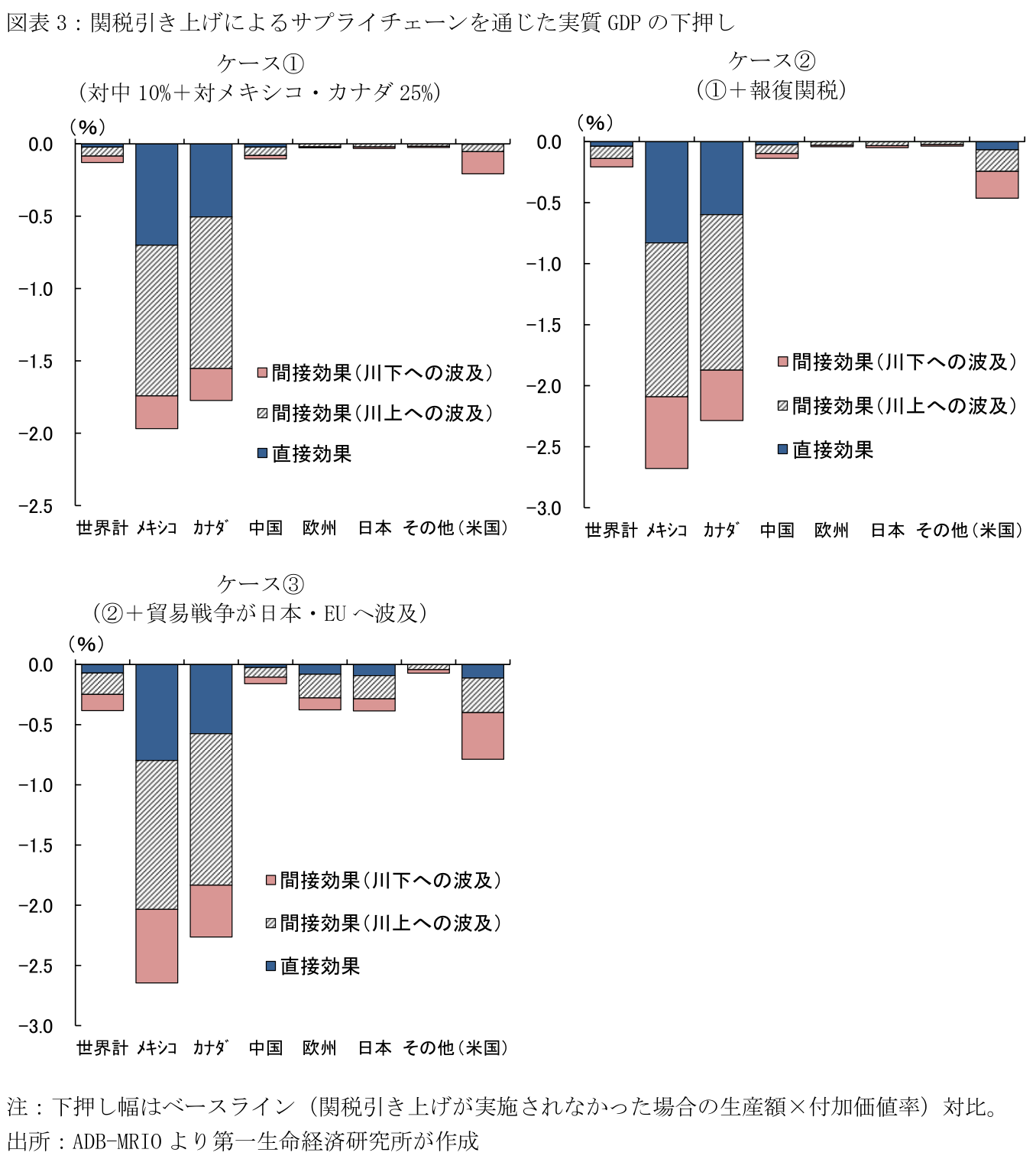 次に、これらの輸出入減少率から各国の財輸出の減少額を計算し、輸出額の減少分だけ各国の生産が減少すると仮定して、国際産業連関表を用いてサプライチェーンを通じた波及効果の試算を行った(注7)。波及効果による各国・各産業セクターの生産額の減少分にそれぞれの付加価値率をかけ合わせることで実質GDPの減少額を計算し、関税引き上げが実施されなかった場合をベースラインとして実質GDPの下押し幅を試算した。図表3が各ケースの試算結果である。