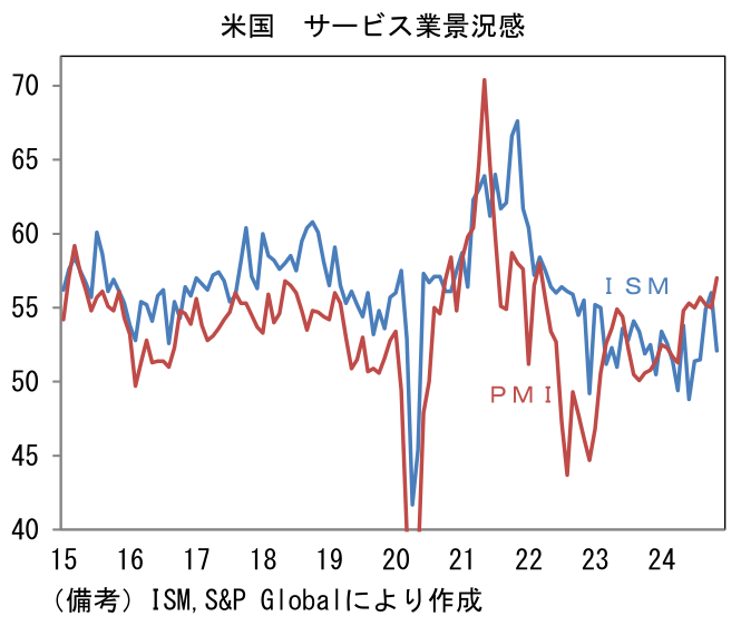 - 11月ISMサービス業は52.1へと3.9pt低下。10月が強めの数値だったこともあり反動がみられた。事業活動(57.2→53.7)と新規受注(57.4→53.7)が低下し、サプライヤー納期(56.4→49.5)も下押しに寄与。市場参加者に注目されている雇用(53.0→51.5)も低下した。もっとも、類似指標のサービス業PMIは11月に一段と上昇している。