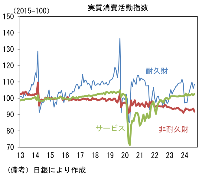 - 二つ目は、シルバー民主主義的利上げとも言うべき視点。日銀の利上げが「円高→輸入物価低下→家計の実質的な購買力増加→実質個人消費拡大」といった具合に上手く伝播すれば、実質GDPにプラスの効果をもたらせる。日銀の利上げが円高を誘発するかは議論の余地があり、また企業収益に与えるマイナス影響を考慮すれば、利上げがマクロ的にプラスの影響を与えるかは疑問であるが、前回利上げ局面の2000年代後半に比べて、円安による輸出増加を通じた景気浮揚効果が弱まっている他、高齢化によって輸入物価上昇に対する脆弱性が増していることは重要。日銀が算出する実質消費活動指数によれば、食料品、衣類、日用品・雑貨などが含まれる非耐久財は減少傾向が続いており、この背景に値上げがあることは言うまでもない。もちろん、2011年の東日本大震災に起因する原発停止とそれに伴う貿易収支の構造的赤字転換によって、円高のデメリットが抑制されたことも、前回利上げ局面との重要な相違点である。利上げが円安抑制に繋がることを所与とすれば、少なくともマイナス影響は小さくなっていそうだ。