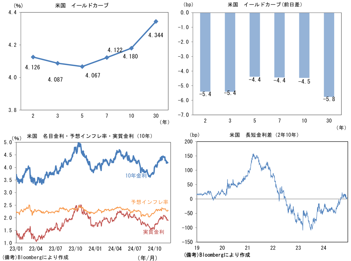 米金利はカーブ全般で金利低下。予想インフレ率(10年BEI)は2.309%(+4.4bp)へと上昇。