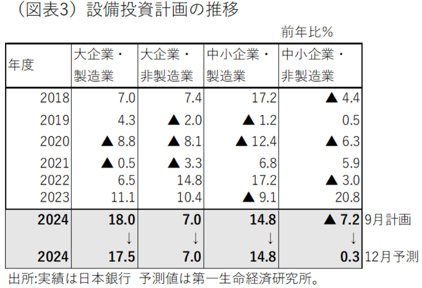 製造業は、大企業の2024年度計画予想が前年比17.5%と2割近い伸びを示すであろう。中小企業の2024年度計画も前年比14.8%の高い伸びを予想する。また、非製造業も堅調な伸び率の見通しである。基本的に、設備投資ブームはまだ継続するという見方である。