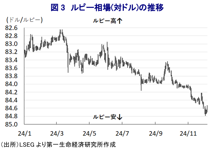 会合後に公表した声明文では、世界経済について「安定を保っているが、地政学リスクや政策の不確実性、とりわけ貿易政策を巡る不確実性を理由に国際金融市場のボラティリティが高まっている」との見方を示す一方、同国経済について「足下では想定を下回っているが、先行きは回復が見込まれるものの、地政学リスクや国際商品市況の動向、世界経済の分断の動きがリスク要因になる」としている。その上で、経済成長率見通しについて「今年度は+6.6%(10-12月+6.8%、1-3月+7.2%)、来年度の4-6月は+6.9%、7-9月は+7.3%になる」と従来見通しから下方修正するも、「リスクはバランスしている」との見通しを示している。また、物価についても「先行きは食料インフレの鈍化が見込まれるが、異常気象と国際価格の上昇が食料インフレの上振れリスクになる」としつつ、「今年のインフレ見通しは+4.8%(10-12月+5.7%、1-3月+4.5%)、来年度の4-6月は+4.6%、7-9月は+4.0%」になると従来見通しから上方修正するも、「リスクはバランスしている」としている。なお、今回の決定については、政策スタンスの据え置きは全会一致であったものの、政策金利については「4(据え置き)対2(25bpの利下げ)」と票割れしており、クマール委員(産業開発研究所(ISID)所長、兼最高経営責任者)とシン委員(デリー大学教授)の2名が反対票を投じたことを明らかにしている。また、会合後にオンライン会見に臨んだ同行のダス総裁は、景気下支えを図るべく、現金準備率を今月14日と28日にそれぞれ25bp引き下げ、これにより1.16兆ルピー規模の流動性拡大を図るとしている。なお、同行による現金準備率の引き下げは2020年3月以来のこととなる。他方、このところのルピー安の動きを巡って「経済のファンダメンタルズを反映して他の新興国通貨に比べてボラティリティは低い」、「市場において決定している」とした上で「外貨準備高は賢明に利用されている」、「為替介入は過剰なボラティリティの抑制のためであり、特定の水準や変動幅を目指したものではない」と述べるなど、昨年にIMF(国際通貨基金)が指摘した動きをあらためて否定している(注3)。その上で、海外からの資金流入を促すべく「非居住インド人(NRI)やインド系住民(PIO)、海外インド市民(OCI)に認められている外貨非居住銀行口座(FCNR-B)の金利上限の引き上げ」のほか、「農業従事者向け無担保ローンの上限引き上げ」、「中小金融機関による事前承認信用枠のUPI(統合決済インターフェース)への接続の認可」といった取り組みを強化する方針を明らかにしている。ただし、中銀による景気、及び物価見通しは些か楽観に傾いていると見込まれ、当面は現行の引き締め姿勢を維持せざるを得ず、そうした状況が景気の足を引っ張る展開が続くと予想される。