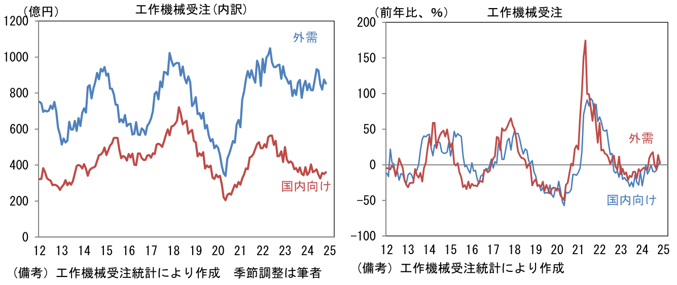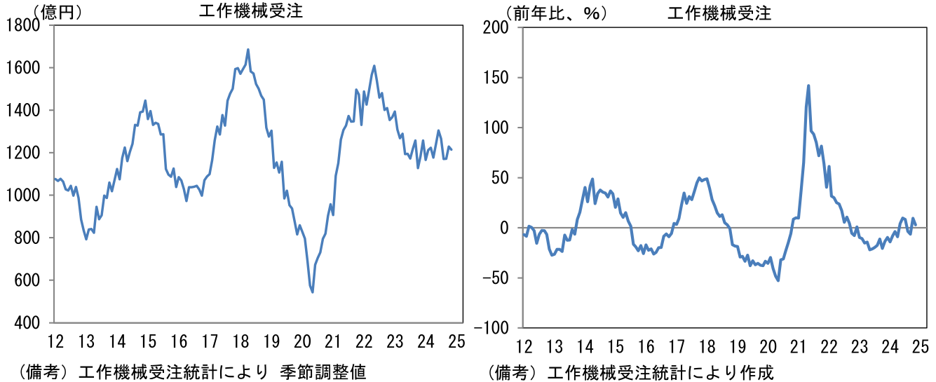 - 筆者が定点観測する工作機械受注統計(日本工作機械工業会)は11月に前年比上昇率が鈍化したものの、大きくみれば回復基調にあると考えられる。受注増加の足取りは遅々としているが、中国の景気刺激策もあり、生産・投資活動の拡大に期待を繋げる動きになってきた。昨日発表された11月の受注額(原数値)は1193億円、前年比伸び率は+3.0%と2ヶ月連続でプラス圏推移。筆者作成の季節調整値は前月比▲1.2%と3ヶ月ぶりに減少も、3ヶ月平均値でみれば+1.2%としっかり。基調的な力強さには欠けるとはいえ、下値固めの様相を呈してきた。単月の内訳は「国内向け」が季節調整済み前月比+3.0%となり、前年比でも+5.0%とプラス圏に浮上。「外需」は前月比▲2.5%と2ヶ月ぶりに減少も、前年比は+2.2%と2ヶ月連続でプラス圏を確保した。