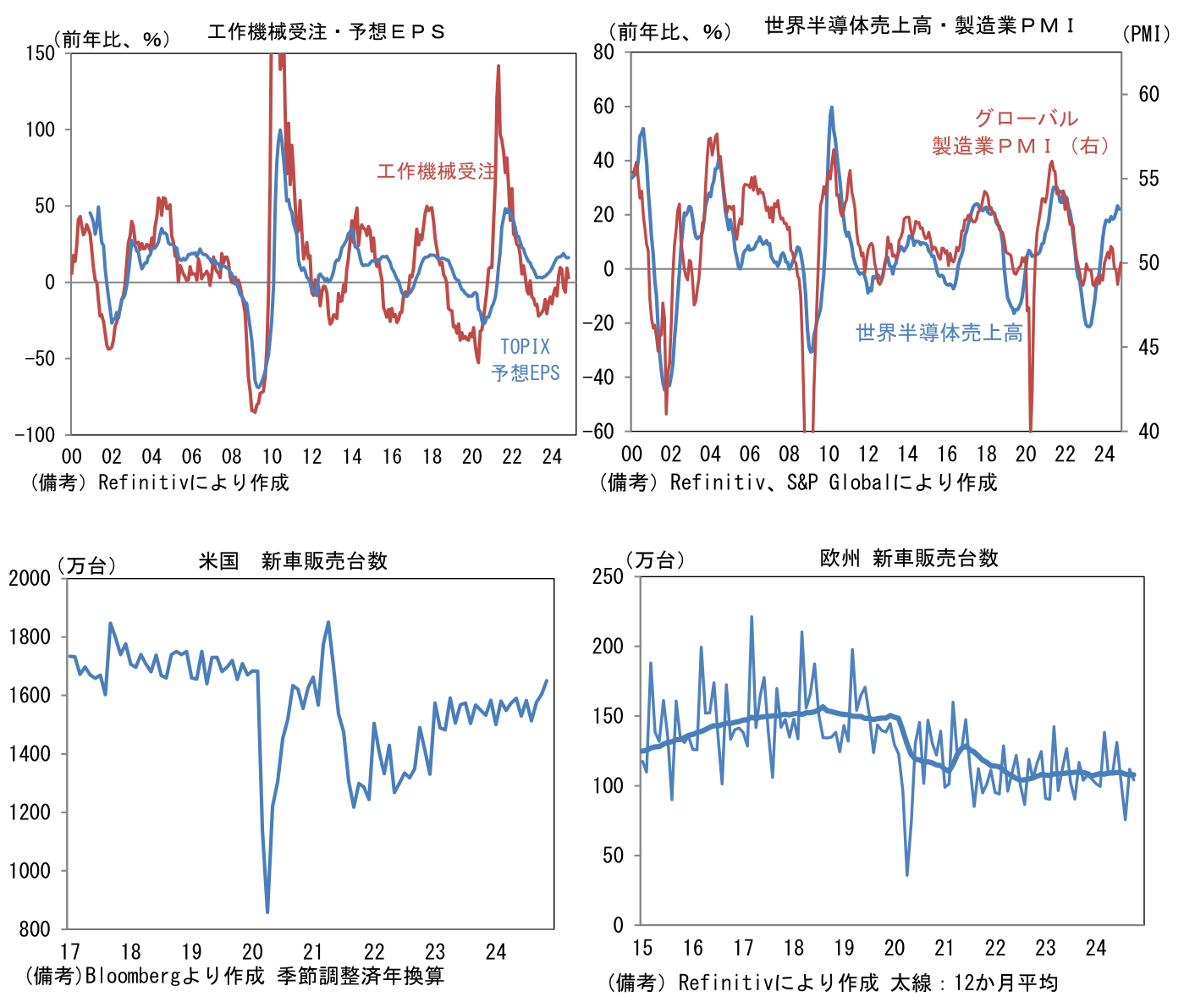 - 先行きは、欧米中銀の利下げや中国の経済対策による政策効果の発現が期待される。利下げが所期の効果を発揮すれば、住宅や自動車の販売回復を通じて世界経済を下支えするだろう。中国は不動産市場が直ちに快方に向かうとは考えにくいものの、一連の景気刺激策は少なくとも短期的には中国経済に恩恵を及ぼすと期待される。そうした下で日本企業の業績予想(TOPIX予想EPS)は円安や資本効率の改善にも支えられ、はっきりとしたプラス圏にある。なお、グローバル製造業PMI(50.0)と世界半導体売上高(前年比+22.0%)には乖離が生じてる。これが半導体以外の業種における苦戦を浮き彫りにしているのだとすれば、今後は自動車関連(特に北米)の生産・投資が復調することでPMIが上向くことで乖離の収斂が期待される。もちろん、ユーロ圏の中核国が苦境から脱することも条件となる。