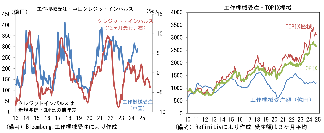 - そこで(昨日も当レポートで取り上げた)中国の新規与信・GDP比であるクレジットインパルスと、中国からの工作機械受注に目を向けると、当面の受注は減少傾向が続きそうだが、そこは中国の景気刺激策が奏功すれば、上向きに転じる可能性がある。また日本国内においては、円安と地政学的リスクに対応したサプライチェーン再構築の動きが相俟って、設備投資を国内に振り分ける動きが顕在化しても全く不思議ではない。米中の経済的分断が深刻化する懸念は一段と高まっているが、それはサプライチェーン再構築の需要を誘発する可能性もあり、リスクは必ずしも下向きではない。日本や米国、欧州における半導体工場の新設もその一環と見做すことができる。そうした下、株価は既に上昇しているが、工作機械受注を見る限り梯子を外されるリスクは和らいでいると判断される。