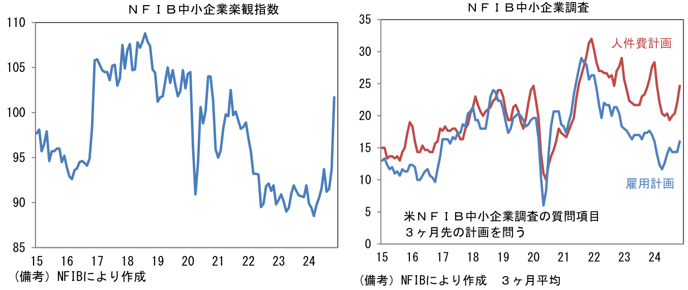 - 11月NFIB中小企業楽観指数は101.7へと急上昇。大統領選を通過したことによる不透明感の後退によって10月の93.7から大幅な改善となった。インフレが落ち着く中、人手不足も緩和したことで景況感は上向きつつある。賃金インフレの帰趨を読む上で有用な人件費計画は+28へと上昇、雇用計画も+18へと反転上昇の気配が明確化している(グラフは3ヶ月平均)。これらの上昇は景気後退懸念を和らげるという意味において朗報である一方、インフレ再燃という点でやや警戒が必要と考えられる。
