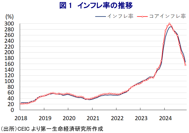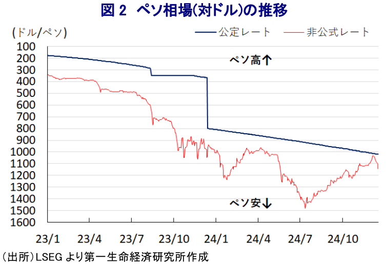 南米アルゼンチンでは今月10日、ミレイ政権が誕生して丸1年が経過した。アルゼンチンを巡っては、1930年代の世界恐慌以前においては世界有数の先進国であったものの、その後の長年に亘る左派政権下での外資排斥や放漫財政の結果、計9回もデフォルト(債務不履行)を経験するなど凋落の歴史を辿ってきた経緯がある。こうしたなか、ミレイ氏は元々リバタリアン(自由至上主義)を標ぼうする経済学者であり、昨年の大統領選では自身が旗揚げした独立系右派政党の「自由の前進」から出馬し、経済の立て直しを公約に掲げた。なお、当初は『泡沫候補』とみられたものの、長年に亘る経済の混乱を受けて国民生活が疲弊するなか、変化を求める若年層などを中心にその主張が受け入れられて次第に支持を集め、決選投票の末に勝利を果たした。他方、ミレイ氏を巡っては、大統領選において公約に中銀廃止や通貨ペソの廃止による経済のドル化といった極端な政策を掲げるとともに、その『型破り』な政治スタイルも影響して、その政策運営に対しては懐疑的な見方が少なくなかったとみられる。ただし、ミレイ政権は公約に掲げた財政健全化を実現すべく、省庁再編により18あった省を9つに統廃合して大臣ポストを減らすことなどで公共支出の大幅削減のほか、国営企業の民営化などによる公的部門の縮小に動くなど『初手』から「ショック療法」的な政策運営に動いた(注1)。さらに、議会内でミレイ政権を支える与党は議会上下院双方で少数派に留まるなか、当初は大統領令を通じた強権的な手続きにより改革を前進させる手法を多用したものの、その後は議会との協議などを通じて公約に掲げた経済改革や緊縮財政を着実に前進させる動きがみられる(注2)。そして、こうした一連の経済改革の動きも追い風に今年は財政収支が黒字化に転じるなど財政健全化の取り組みが着実に前進しているほか、300%近くに達したインフレ率も頭打ちに転じるなど物価を巡る状況も大きく改善している。11月のインフレ率は前年比+166%と極めて高い水準にあることには変わりがないものの、前月比は+2.4%と4年ぶりのペースに抑えられるなど改善が進んでおり、年利換算すると30%超と歴史的にみれば経済危機に陥る直前の水準まで抑えられる可能性が出ている。一方、インフレが常態化する背後では、国民生活は通貨ペソを使用しない流れが広がるなど事実上の経済のドル化が進んでいるほか、ペソの対ドル相場は公定レートベースで一貫して下落基調が進んでいることも、結果的にインフレが高止まりする一因になっている。なお、ペソの対ドル相場を巡っては、公定レートと実勢レートに当たる非公式レートの二重構造となっており、昨年の大統領選でのミレイ氏勝利を受けて非公式レートとの乖離が大きく広がる事態に見舞われたものの、足下においては財政健全化に道筋が付きつつあるほか、インフレも依然高水準ながら頭打ちの動きを強めるなど物価動向も改善している。こうした動きを追い風に国際金融市場では、ミレイ政権が主導する経済立て直しの動きを評価する向きが広がっており、こうした動きも追い風に足下では両者の乖離が急速に縮小する動きがみられる。また、主要株式指数(メルバル指数)についても同様に、ミレイ政権による経済構造改革の進展やそれに伴う経済の立て直しを期待する向きが強まるなか、昨年以降は上昇の動きを強めるとともに、足下においてはその動きが一段と加速して最高値を更新する動きが確認されている。ミレイ政権による経済政策については、同国を支援するIMF(国際通貨基金)も評価する姿勢をみせており、過去に9度もデフォルトに陥るなど信用失墜が続いた同国を取り巻く環境は着実に変化していると捉えられる。