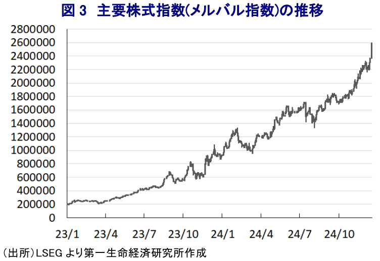 - 南米のアルゼンチンでは今月、ミレイ政権が発足から丸1年を迎えた。リバタリアン(自由至上主義)を標ぼうするミレイ氏は、財政健全化を目指して「ショック療法」的な政策運営に舵を切った。結果、一時は300%弱に達したインフレは頭打ちに転じ、通貨ペソ相場も公定レートと非公式レートの乖離が縮小している上、今年は財政黒字化も視野に入りつつある。金融市場では同国への評価が向上するなか、主要株式指数は最高値を更新する動きもみせている。デフォルト常習国である同国を取り巻く環境は着実に変化している。