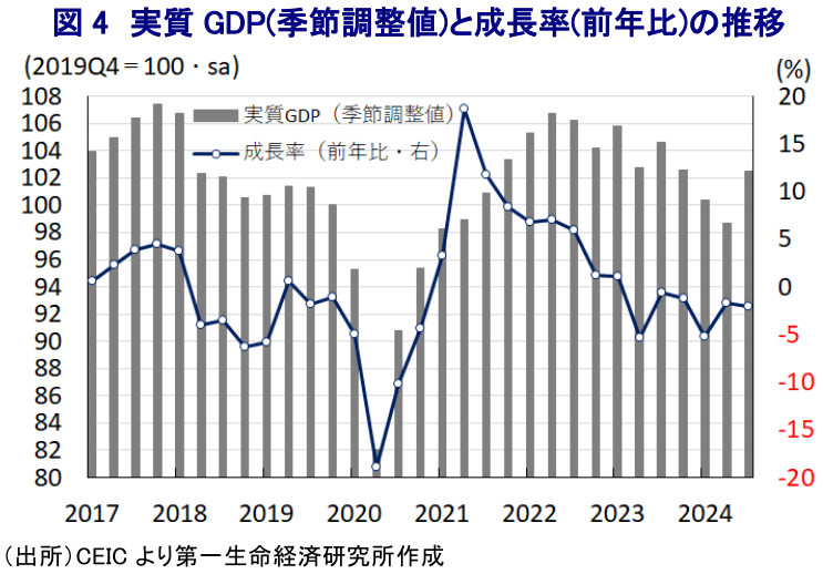 - 他方、ミレイ政権によるショック療法を受けて景気は頭打ちの流れが続いたが、インフレ鈍化や金融市場における評価向上を受けた資金流入などを追い風に実体経済を取り巻く環境は変化しつつある。7-9月の実質GDP成長率は前期比年率+16.4%と4四半期ぶりのプラス成長に転じており、内・外需双方で景気底入れを促す動きがみられる。外交面では中国との関係で雪解けを演出するとともに、米トランプ次期大統領との良好な関係が経済を後押しするとの期待も高まっている。ただし、ショック療法に伴い貧困率は5割を上回るなど国民生活は大打撃を受けている。現状はミレイ氏自身の支持率の高さが厳しい政策への逆風を和らげているが、今後は早期に経済回復が国民生活に恩恵をもたらす形に持っていくことが必要となる。