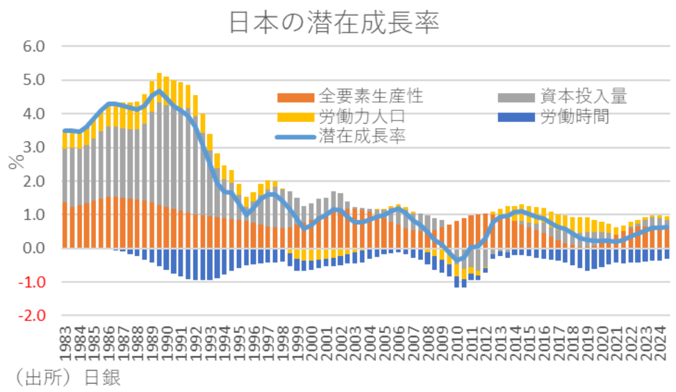 こうした実質設備投資の変化を成長会計に基づいて解釈すれば、23年度のように設備投資額が減少し、有形・無形の固定資産の蓄積が停滞すれば、資本投入量や全要素生産性の低迷を通じて潜在成長率の低下につながることになる。このため、いくら投資財の価格の上昇によって名目の設備投資額が膨張しても、実質の設備投資額が低迷すれば、実質的な生産性の低迷などを通じて実質賃金も上がりにくくなる。経済成長の好循環に繋がらないことによって、長期停滞から抜け出せない可能性がある。
