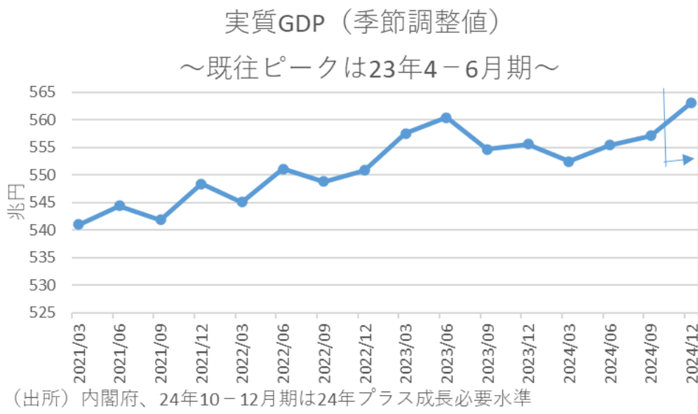 そして、仮に2024年暦年の経済成長率がプラス成長になる条件をはじき出せば、来年2月に公表される24年10-12月期の実質GDPが水準では前年比+1.3%で過去最高を更新し、前期比年率の伸びに至っては+4.4%程度の成長が必要になると試算される。