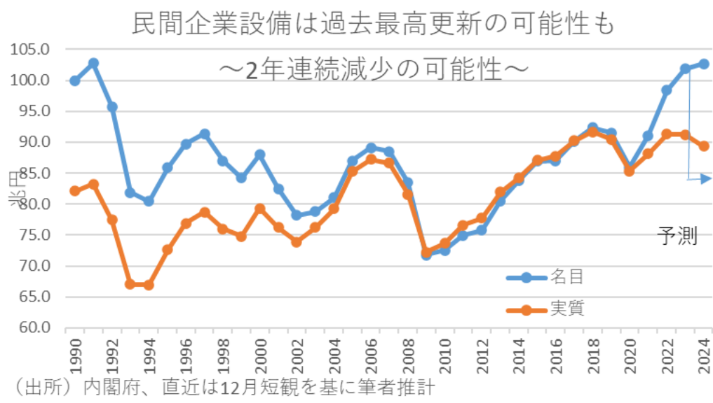 これによれば、23年度の経済成長率は速報値の+0.8%から+0.7%に下方修正された。最大の要因は民間在庫変動の寄与度が▲0.2%ポイント下方修正されたことだが、驚くべきことは、好調とされていた民間企業設備投資が速報値では実質で前年比+0.3%であったが、年次推計値では同▲0.1%に下方修正されたことである。
