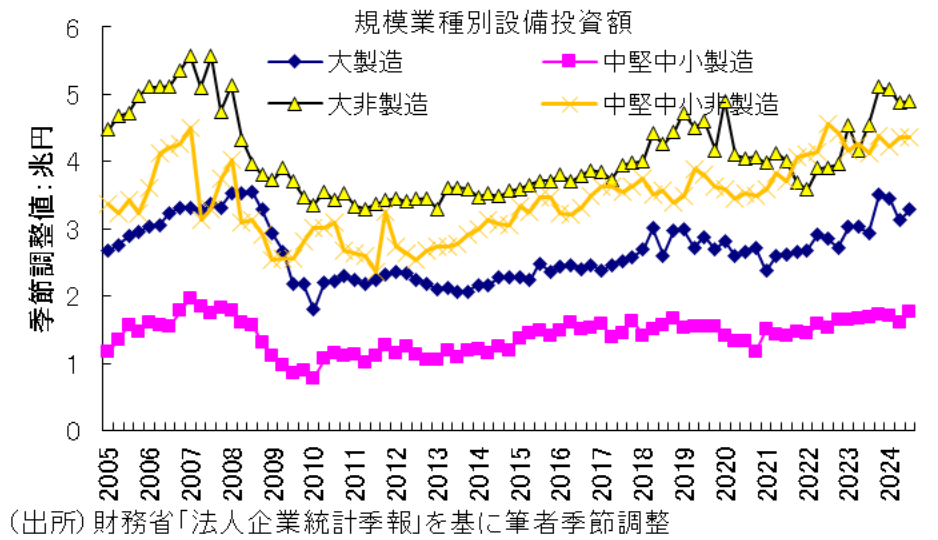 なお、24年度に設備投資が軟調になっている背景としては、2023年10-12月期をピークに大企業の設備投資が減少トレンドにあることが指摘できる。実際、財務省の法人企業統計季報を基に規模・業種別の設備投資額の推移を見ると、製造業・非製造業とも昨年10-12月期をピークに設備投資額が減少していることがわかる。