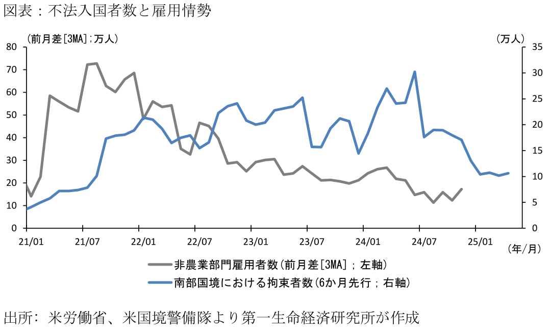 - 11月の雇用者数はストライキやハリケーン上陸の影響の剥落を背景に、前月から大幅に加速するなど、米国経済は堅調さを維持している。一方、24年6月以降の不法移民流入の減速を背景に、25年初から雇用の増加ペースが鈍化するリスクに警戒が必要だろう。